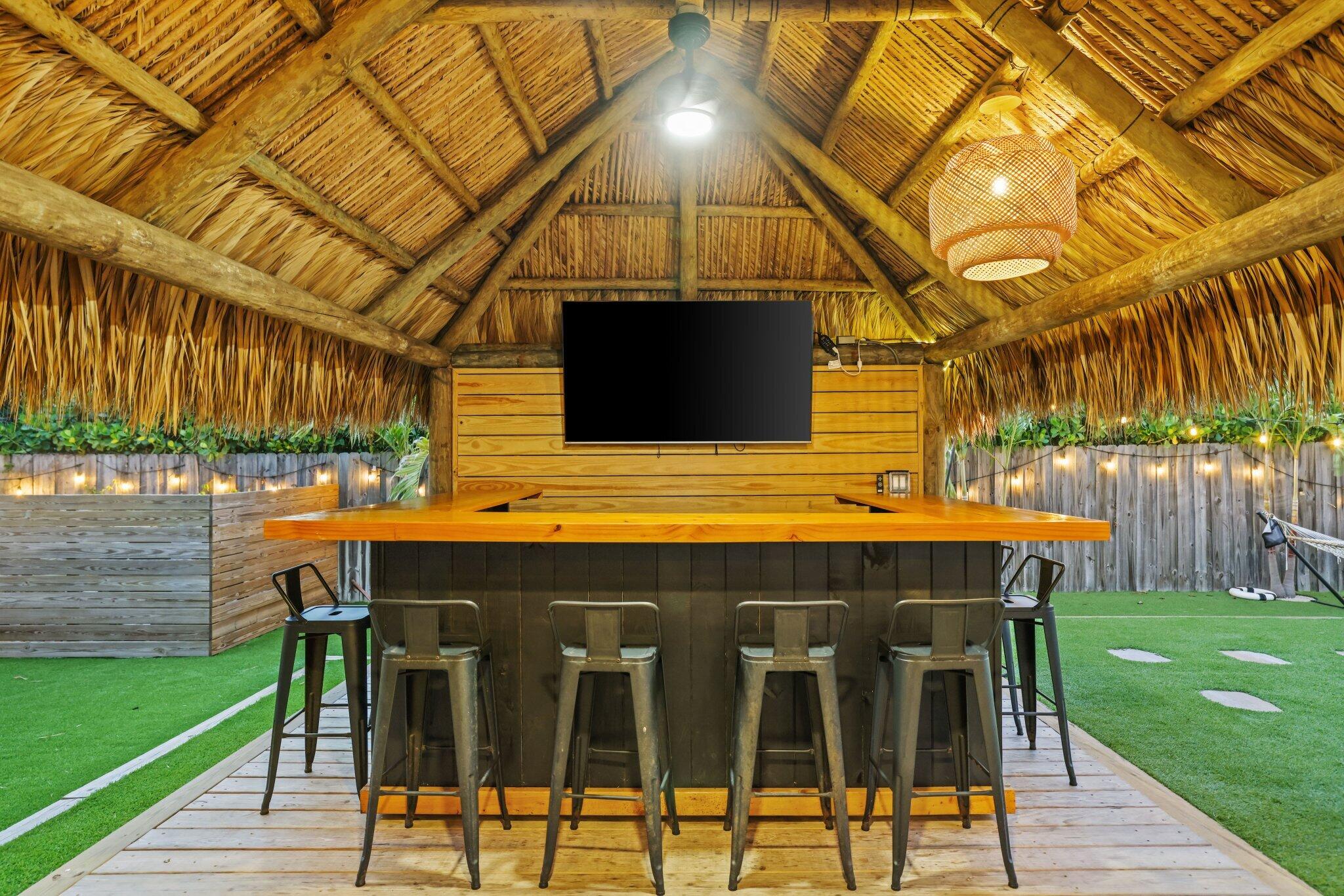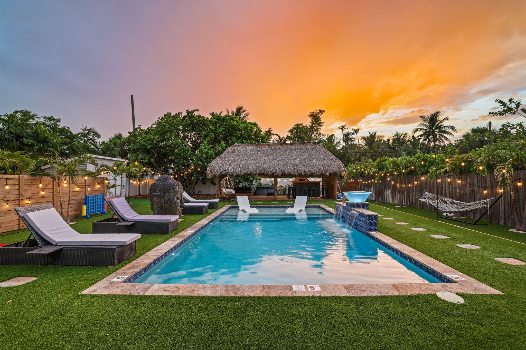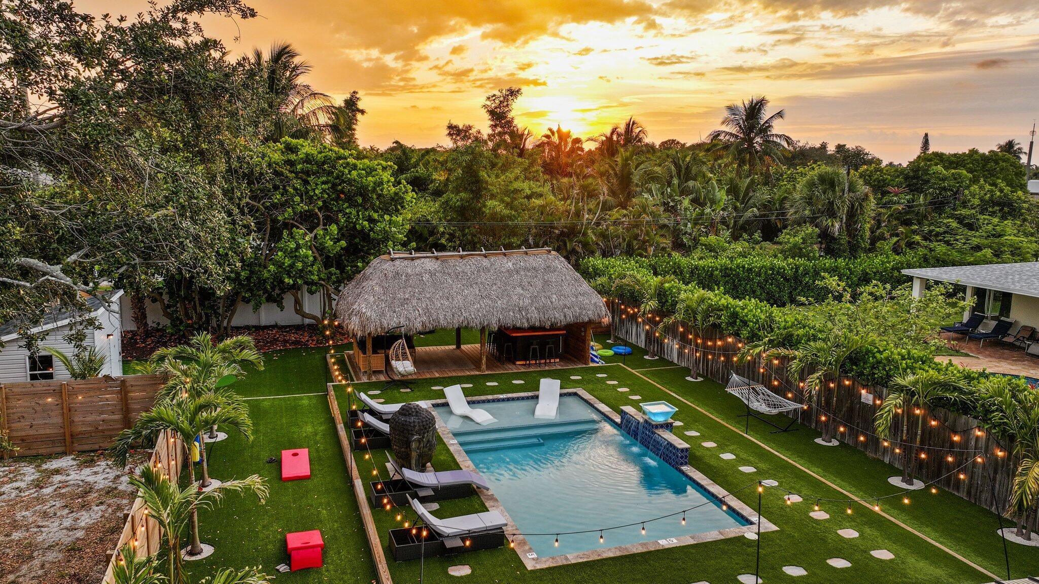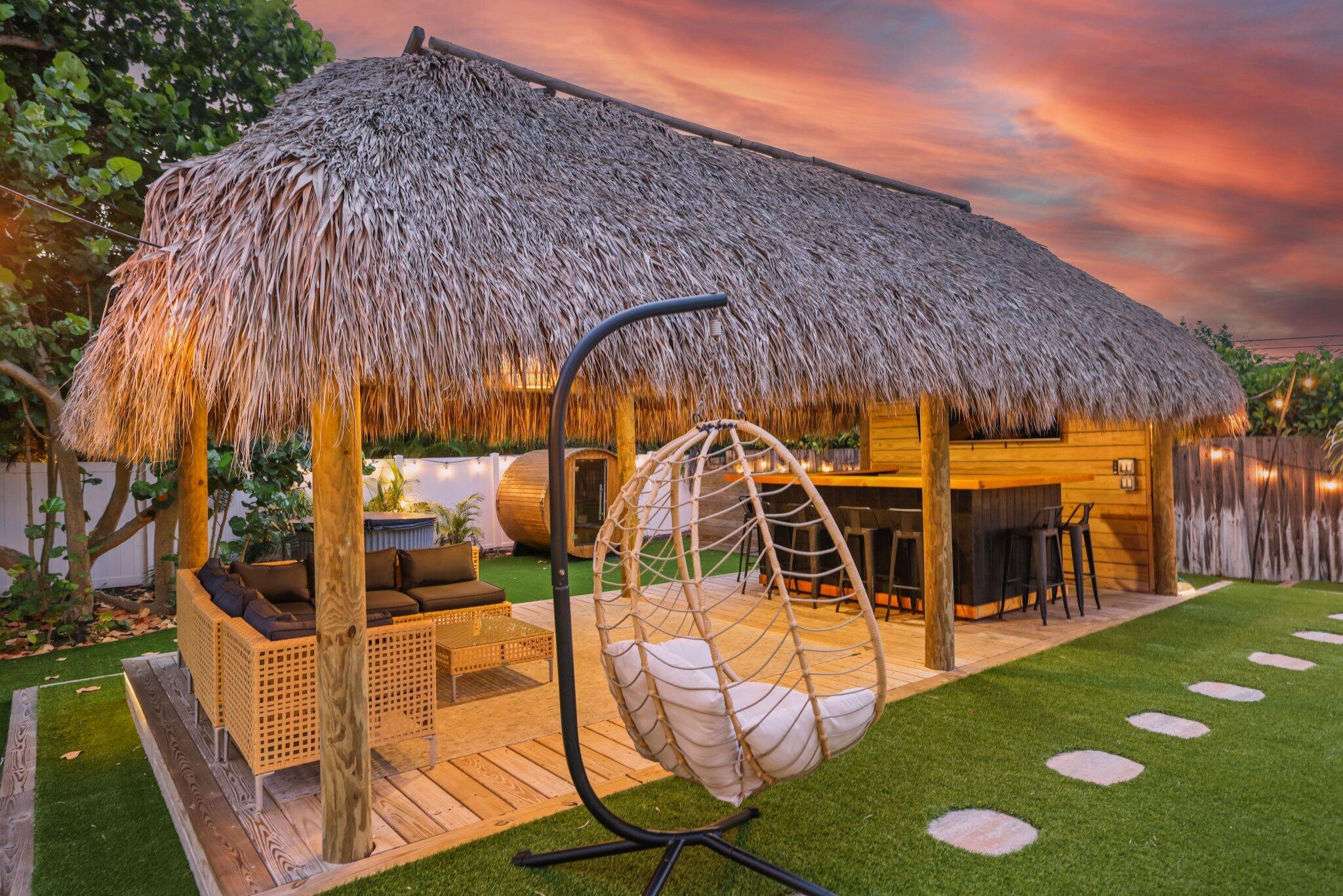 Introducing a rare opportunity to own a resort-style retreat in the heart of downtown Delray Beach. This stunning 3-bedroom home is perfectly positioned in one of South Florida's most vibrant and desirable neighborhoods. Set on a spacious 0.26-acre lot, the property offers both luxurious living and exceptional investment potential. Step into a tropical backyard oasis designed for relaxation and entertainment. Enjoy a sparkling pool, soothing hot tub, and private sauna--creating the ultimate outdoor escape. The lushly landscaped yard features a tiki hut with a built-in BBQ grill and ample outdoor seating, ideal for hosting gatherings or enjoying a quiet evening under the stars. Inside, the home utilizes a thoughtfully designed layout with a bright, functional kitchen,