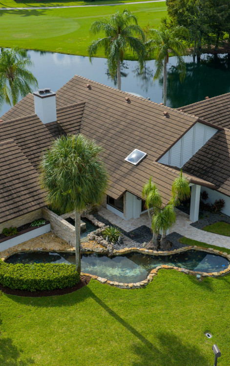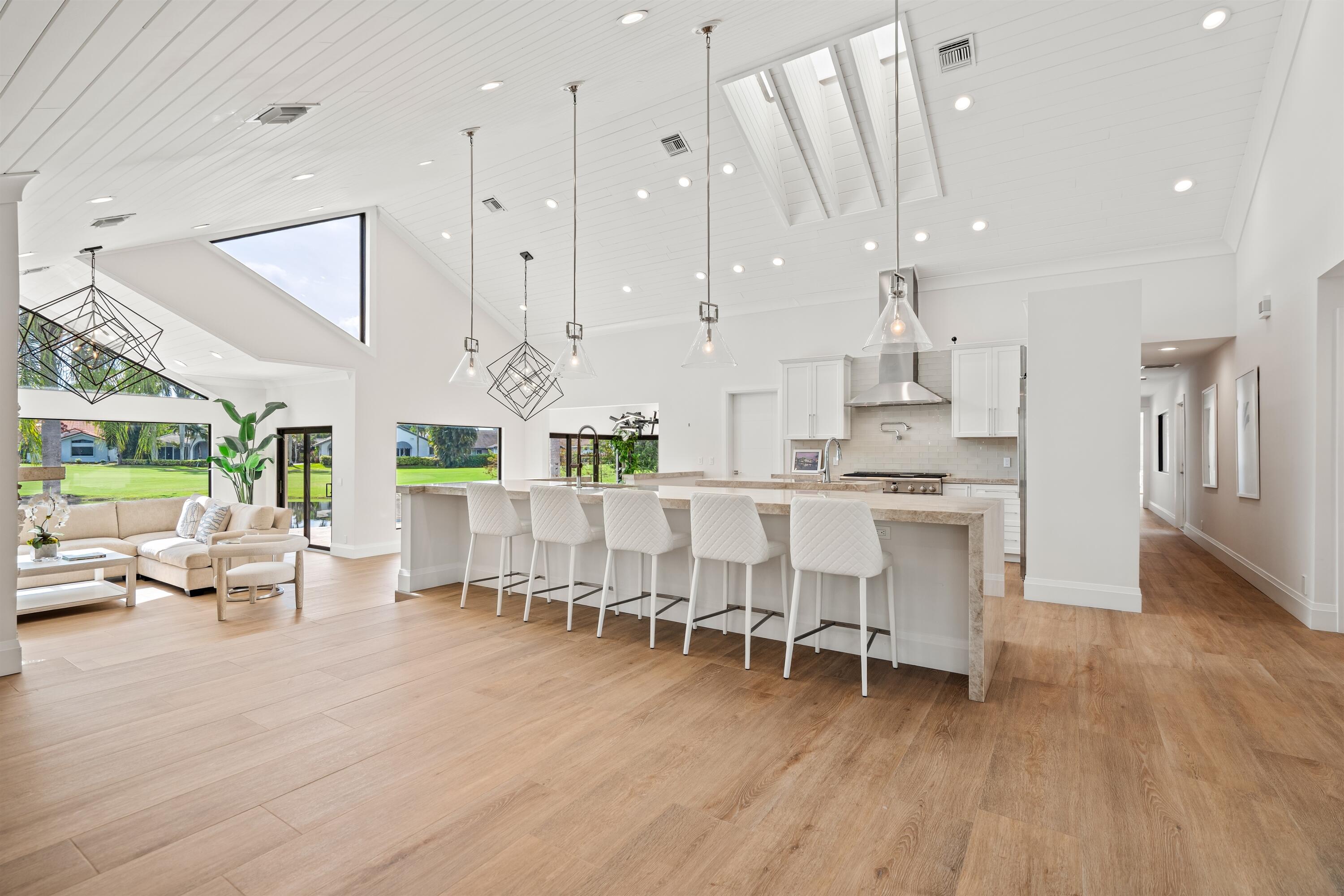 Enveloped within the beauty of its natural setting and defined by luxury, this completely remodeled East Coast style residence captures tranquil panoramic lake and fairway views as well as beautifully manicured fairway vistas from every room. With four bedrooms and spanning 4,714+/- total square feet, details throughout include dramatic tongue-and-groove vaulted ceilings punctuated by skylights, wide-plank washed-oak imported porcelain flooring, and window-walls of impact glass throughout. From the double-door entry, an inviting lounge, with a built-in bar topped by quartzite and featuring a refrigerated wine tower, introduces the dramatic open-floorplan living area of this spectacular residence. The chic great room features tongue and grooved wood vaulted ceiling, a wood-burning