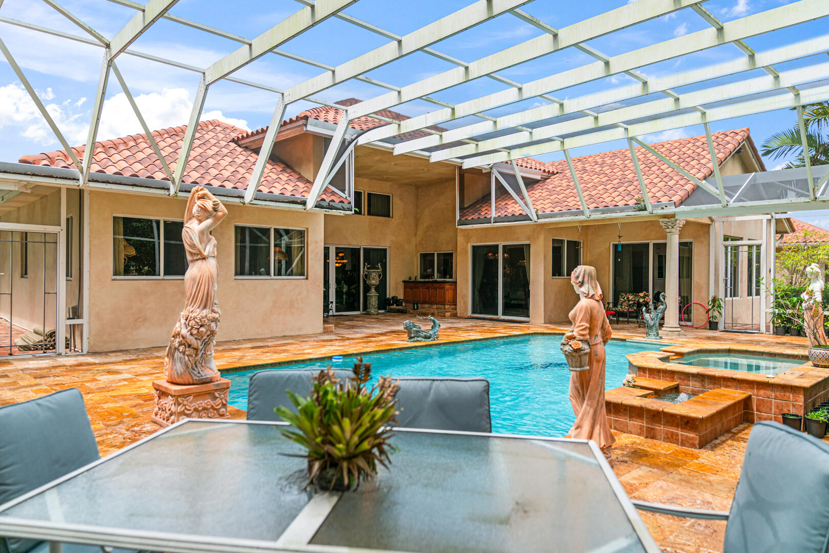Welcome to 16090 Rio Del Paz, an extraordinary estate that blends timeless European grandeur, South Florida waterfront living, and the comfort of modern updates into one rare offering. Situated on over 1.15 acres in the heart of Delray Beach, this iconic residence delivers more than 8,300 square feet of interior living space, with 8 bedrooms, 7 full baths, and 1 half bath, all thoughtfully designed to accommodate both intimate living and large-scale entertaining.From the very first impression, this estate announces itself as one of a kind. Thirty-four towering Corinthian pillars frame the exterior, while five Angel Water fountains and thirteen hand-crafted statues enhance the approach and outdoor grounds, immediately creating the sense that this is more than a home it is a