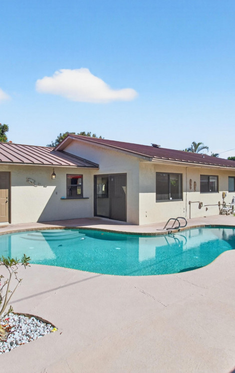 Enjoy the best of East Delray Beach with no HOA! Owner financing available. This beautifully maintained 3BR/2BA home on a spacious corner, fenced lot features a private saltwater pool with a new energy-efficient pump. This home has a 2-car garage. In the large back yard there are lush fruit trees, and patio in back to relax. Updates include a newer metal roof with attic cooling fans, impact windows and doors, vinyl fencing, wide plank laminate flooring, AC (2020), Rheem water heater (2019), updated electrical panel, and Halo air filtration system. Popcorn ceilings just removed. The kitchen offers custom cabinets, pull-outs, butcher block shelves, and modern appliances. Outside the large backyard offers privacy and a side area to put a boat or RV with a bonus electrical panel for