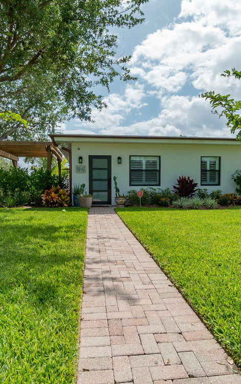 Coastal living in an exquisitely updated single story home. A short walk (3blocks) to bustling Atlantic Ave Only 2 blocks to the newly constructed Sundy Village shops and restaurants.Be a part of all the action in the Village By The Sea. COMPLETELY RENOVATED in 2023, all electrical, plumbing, roof, hurricane impact doors and windows. Hard wired alarm system with multiple exterior cameras. Open concept living space with hardwood flooring, built-ins for office area. Murphy bed in 2nd bedroom. All windows with Plantation Shutters. Backyard Sanctuary with lush, landscaping to create a private retreat around a resort-style heated, salt water pool. Secluded area for ample outdoor seating. Outdoor shower, completely fenced lot. Perfect for Air BnB or expansion for family residence. Zoned