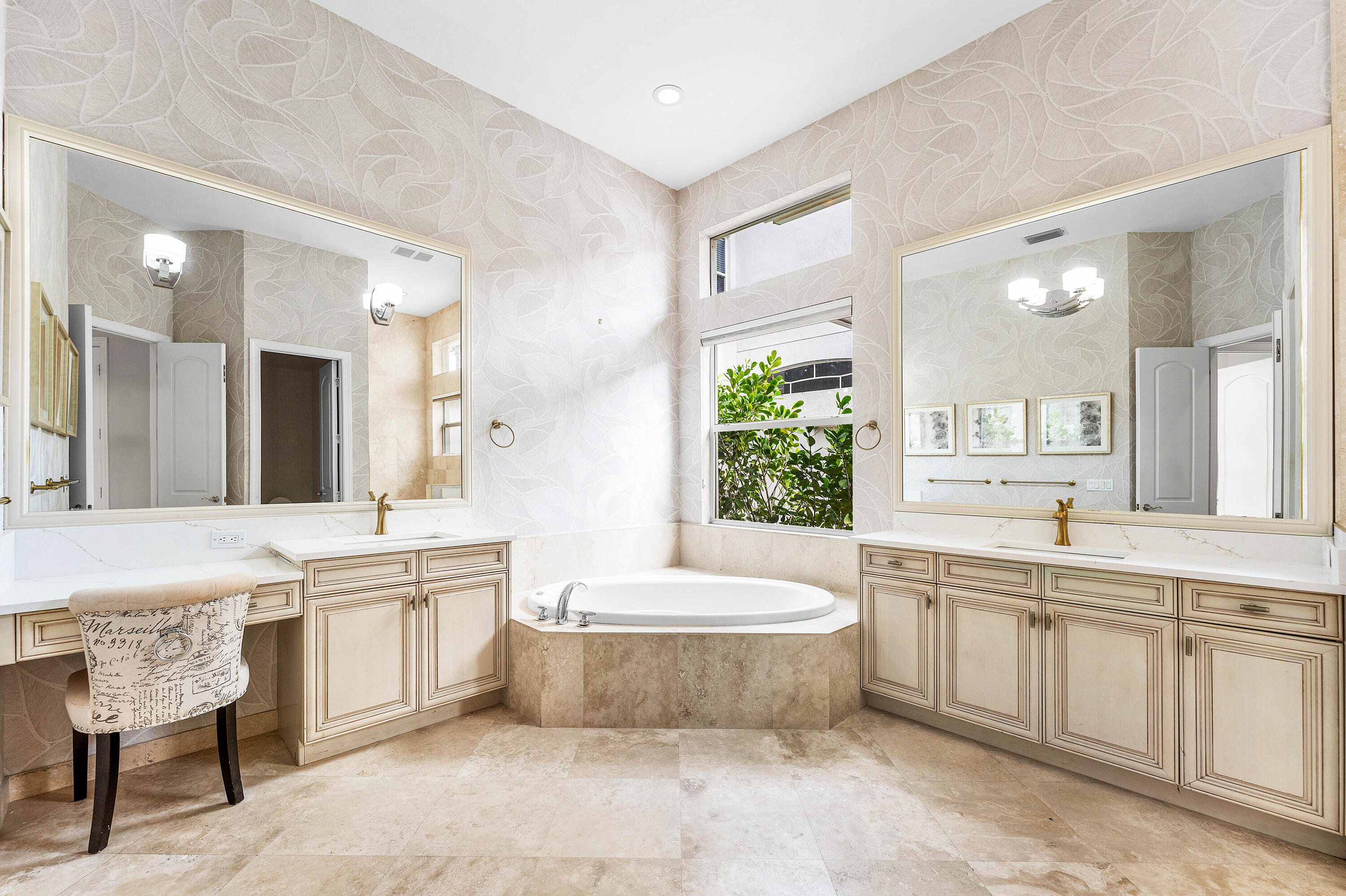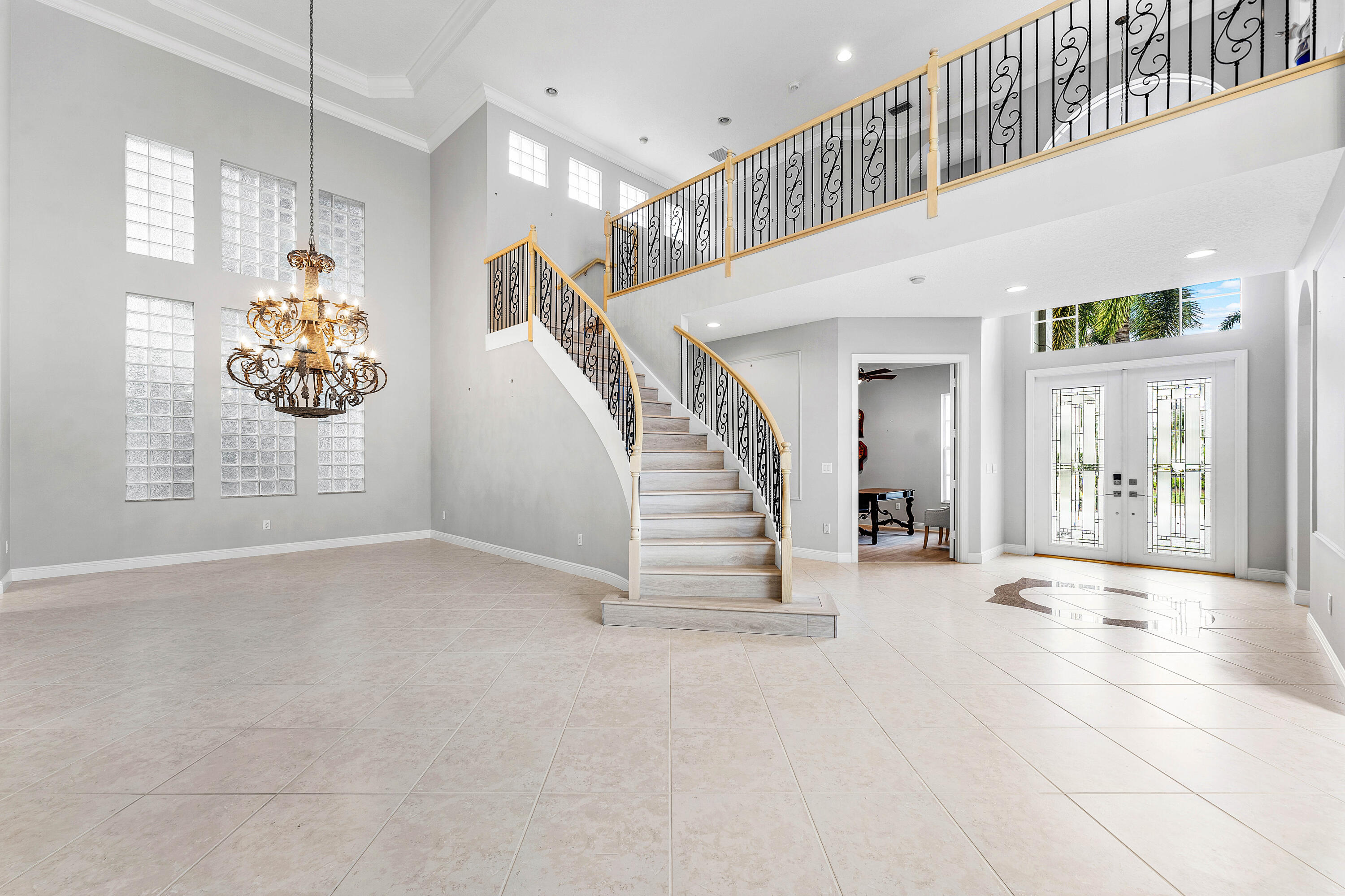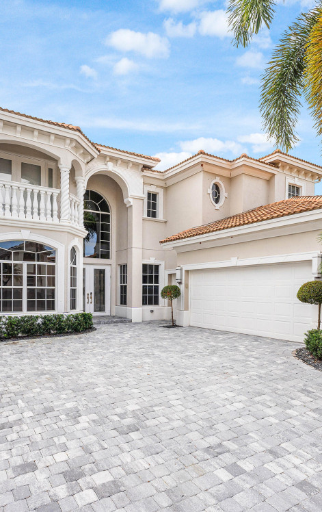 This Mizner Country Club home w/ Southern exposure offers immediate sports membership & home features 4 bedrooms, 5.1 baths, plus an office. Highlights include new quartz countertops in kitchen & baths, new flooring in office & upstairs, a resurfaced pool, newer outdoor kitchen, custom raised deck, & expanded driveway. A two-story covered entry opens to a spacious foyer, study, & private en-suite guest room. Soaring ceilings & a curved staircase frame the formal living & dining areas. The family room adjoins the covered lanai w/full cabana bath & the generous kitchen. The primary suite has coffered ceilings, two walk-in closets, & a luxurious bath. Upstairs, two en-suite guest rooms connect to a loft overlooking the main living spaces. Mizner Country Club offers resort-style living w/an