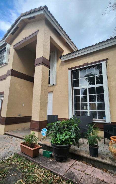 The Happy Home-Located on a quiet cul-de-sac within Doral Gardens,a gated community. Spacious 2 Story home HOA (Only $315.00 Monthly), Built 2000. 4 Bedrooms 3 full baths. Atractive "split floorplan" for multi-generational lifestyle. (Upstairs-3 bedrooms 2 baths Downstairs- One bedroom 1 full bath.) 2 car garage, Updated kitchen, counter seating. Food & butlers pantry. Laundry room, Lots of storage space throughout. Natural light and high ceilings fill this home with great energy. Full storm protection. Great floorplan and location. Well maintained, home is ready for you to enjoy it is (TURNKEY & MOVE-IN READY!) Private back yard with covered terrace enjoy as-is or build a pool ! Ample parking for family and friends.