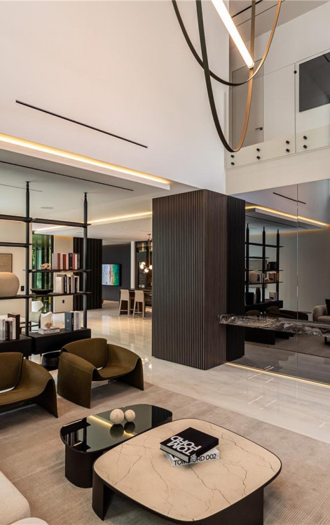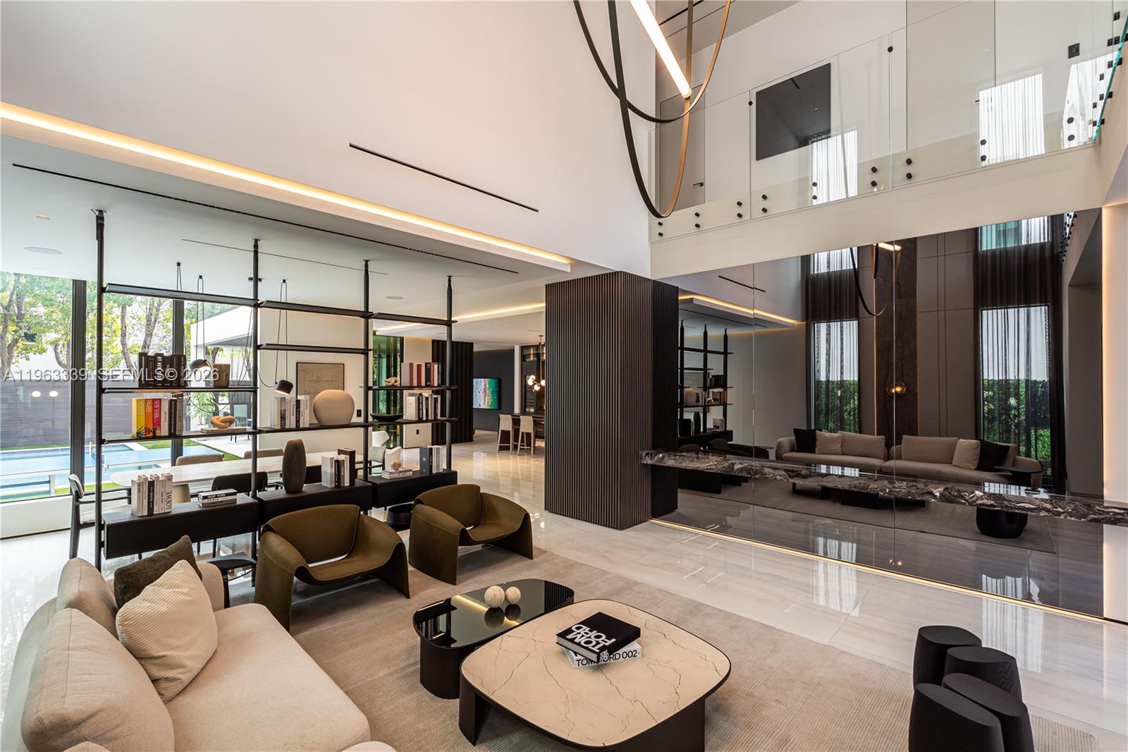 This minimalist contemporary luxury home is a masterfully designed residence curated with uncompromising attention to detail, delivering a true high-end living experience. The home features a full WAC architectural track lighting system throughout, complemented by recessed linear LEDs, ambient cove lighting, and a dramatic Flos AIM statement fixture accentuating the double-height living space. A fully integrated Smart Home system with Lutron Shades and Control4 allows seamless control of lighting, climate, and ambiance, while a whole-home speaker system provides integrated audio throughout. Interiors showcasing sculptural contemporary pieces and anchored by a striking Lexington central shelving unit by Poliform, conceived as a gallery-style architectural focal point. The residence is finished with large-format marble-design flooring and flawless Level 5 smooth wall finishes, reflecting a museum-quality execution. Custom sheer and blackout drapery systems provide refined light control and privacy throughout. The Italian Poliform kitchen is a true showpiece, featuring sleek European cabinetry, premium integrated appliances, and an oversized full-slab waterfall island—ideal for both entertaining and everyday luxury living. The primary suite offers a boutique-style custom walk-in closet with illuminated shelving. A finished garage adds versatility as a lounge, studio, or private gym. Every element of this home reflects a refined, luxury standard.