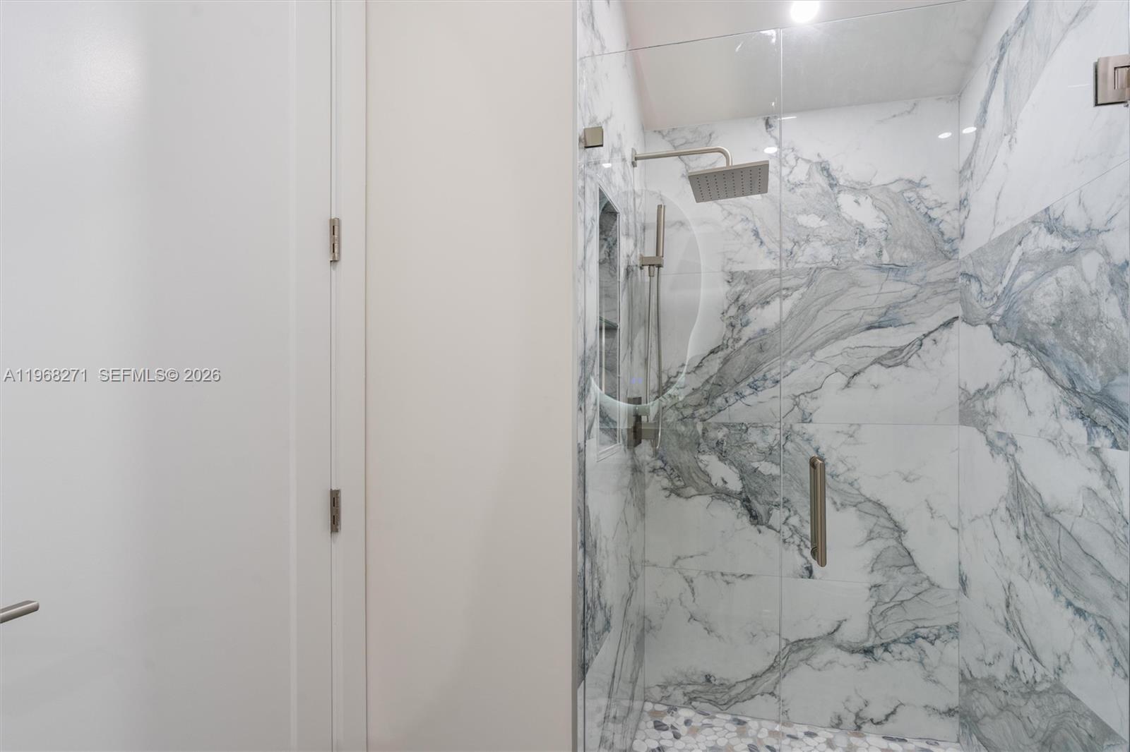 The chef’s kitchen is equipped with a Thermador Professional appliance package, gas range, built-in refrigerator, imported stone countertops, and floor-to-ceiling cabinetry. An indoor bar with dedicated wine and beverage centers enhances entertaining.