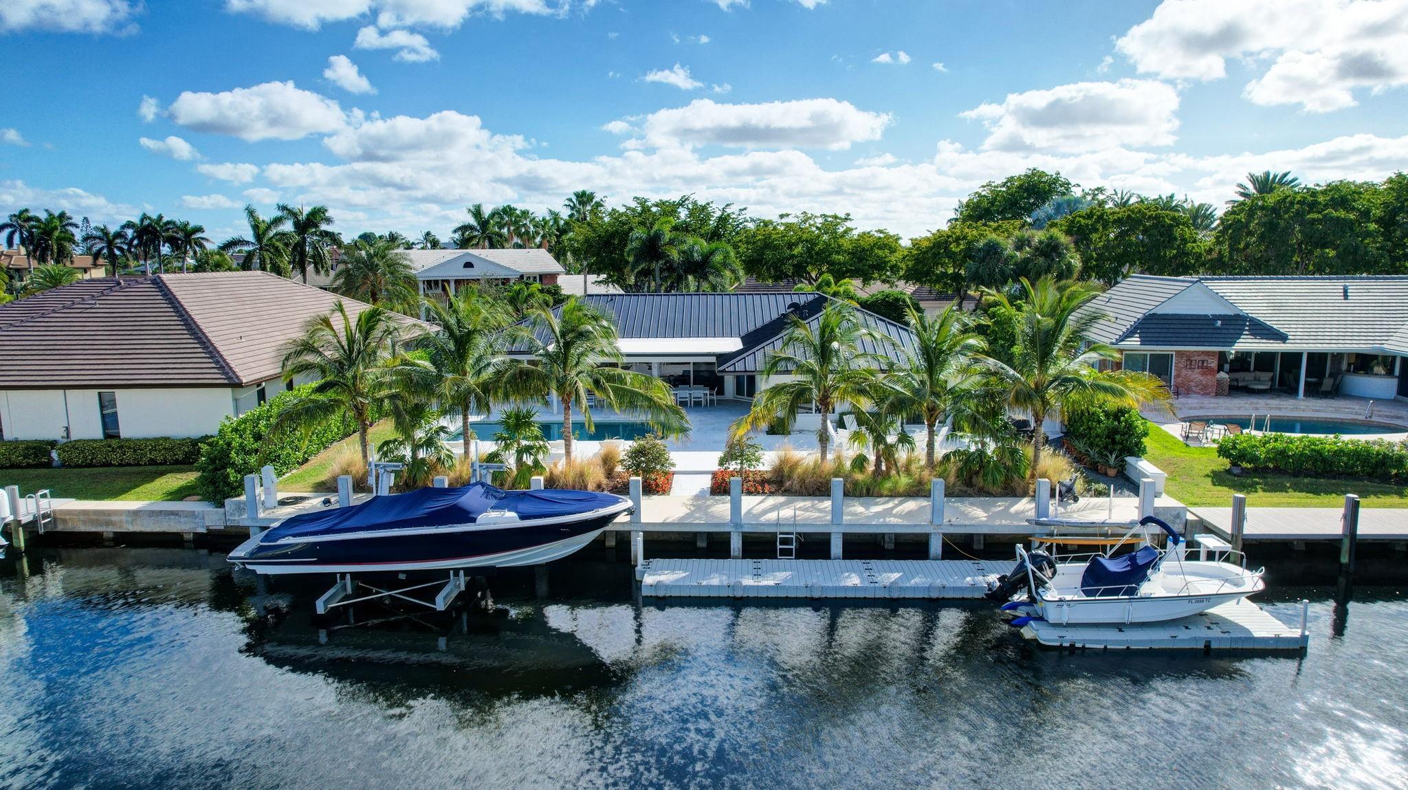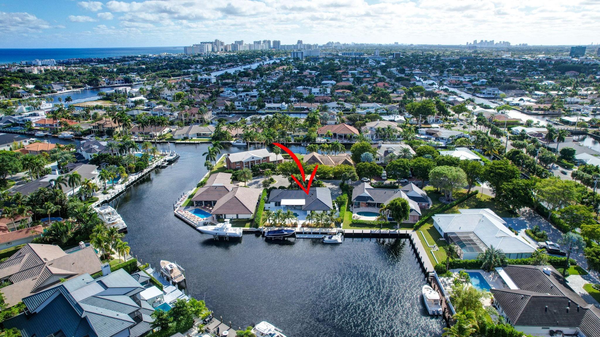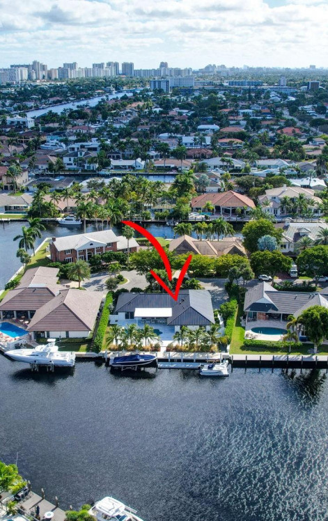 Located in Fort Lauderdale's premier 24/7 armed security guard-gated deepwater community. Enjoy stunning simplicity & functionality. Custom island-inspired single level residence. 2022 total renovation shows as NEW: metal roof, plumbing to street, all new electrical, air conditioners, tankless water heater & generator. Latest open concept living, great room, new Chef's kitchen, porcelain tile floors, new impact glass & interior doors. Private Primary Suite, dual closets, new modern spa style bath, enclosed water closet, soaking tub & floating vanities. Split floorplan: 2 secondary bedroom suites, office (4th bed) + cabana bath, air-conditioned garage. Most rooms access pool & wide-open radius turning basin views, 95 ft protected dockage. Perfectly Pine Crest & other A rated school location