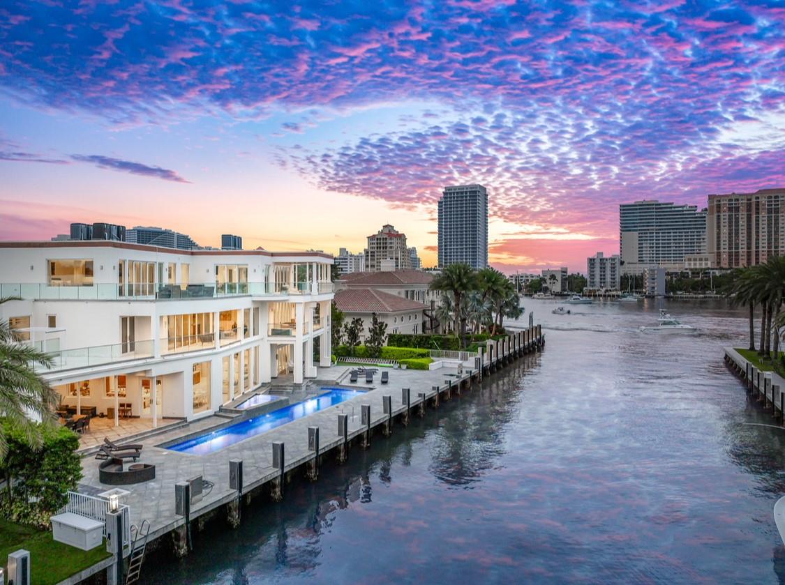 Exquisite LAS OLAS waterfront estate. Blends 3-story modern design, quality materials & craftsmanship, Intercoastal & skyline vistas, 140’ deep water dockage & every luxury amenity: Chef’s gas kitchen, top-of-the line appliances; bar, wine storage & tasting area; large formal dining, spacious family & living rooms perfect for displaying art & elegant yet casual living. 6-7 bedrooms; 2 master suites; spacious walk-in closets; home theater; game room & bar; large gym; 60’ pool; office; 2000+ sq ft of outdoor decks with dramatic water & skyline views perfect for entertaining; outdoor kitchen; garage for 8 cars; gas generator; commercial glass elevator; walled & gated; security cameras, commercial storm water drainage system, quick ocean access, walk to beach. 7-Isles 24/7 guarded & patrolled.