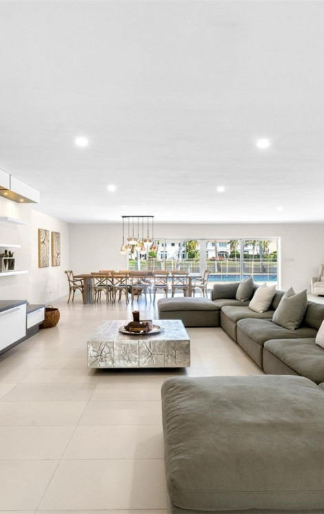 Modern waterfront residence with private dock and deck, offering open water views and a beautifully designed backyard setting. The pool, expansive patio, and dedicated outdoor dining area create an ideal space for entertaining or enjoying the waterfront backdrop. Inside, the open layout connects the main living and dining areas with abundant natural light throughout, along with an additional family room just off the main living space. The main kitchen is equipped with premium appliances, a large island with cooktop and seating, and ample cabinetry. Behind the kitchen is a separate pantry and prep workspace complete with a second refrigerator, sink, and additional storage. The full laundry room and garage are conveniently located just off the kitchen. A private guest suite with full bath is also situated off this wing of the home. The primary suite includes dual vanities, soaking tub, separate shower, oversized walk-in closets with built-ins, and direct access to the pool. Two additional bedrooms share a Jack and Jill bathroom, each with generous closet space and a large connecting hallway closet. Additional highlights include a spacious circular driveway providing ample parking. A modern waterfront home offering functional design, generous living spaces, and exceptional outdoor amenities near the best of Hollywood.