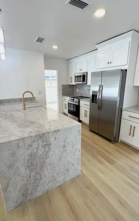 This single family home is located in the Hollywood Hills area and has 3 bedrooms and 2 bathrooms, along with an additional enclosed room that may be used as a 4th bedroom, office, or flex space. The home has been fully remolded and updated with a new kitchen featuring white cabinetry, gold tone hardware, stainless steel appliances, and a large island. Interior features include new wood style laminate flooring, updated bathrooms, and fresh interior and exterior paint. French doors lead to the patio and pool area, creating a bright and open connection to the outdoor space. The pool has been resurfaced and the pool deck has been updated, for a great backyard to enjoy. Additional features include a new washer and dryer and a circular driveway. All bedrooms, including the primary bedroom have direct patio and pool access with access to the backyard, a walk in closet, and an updated bathroom that will leave you feeling like you are at the spa. No HOA and convenient access to shopping, dining, parks, and is approximately six miles from Hollywood Beach.