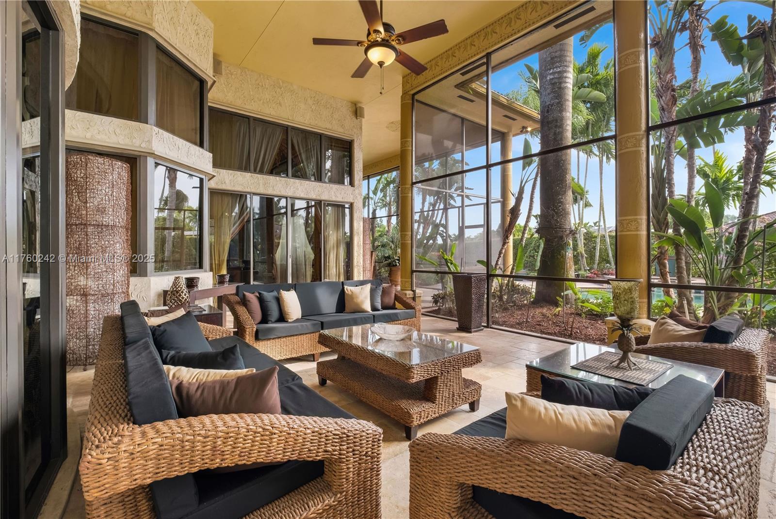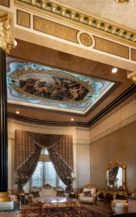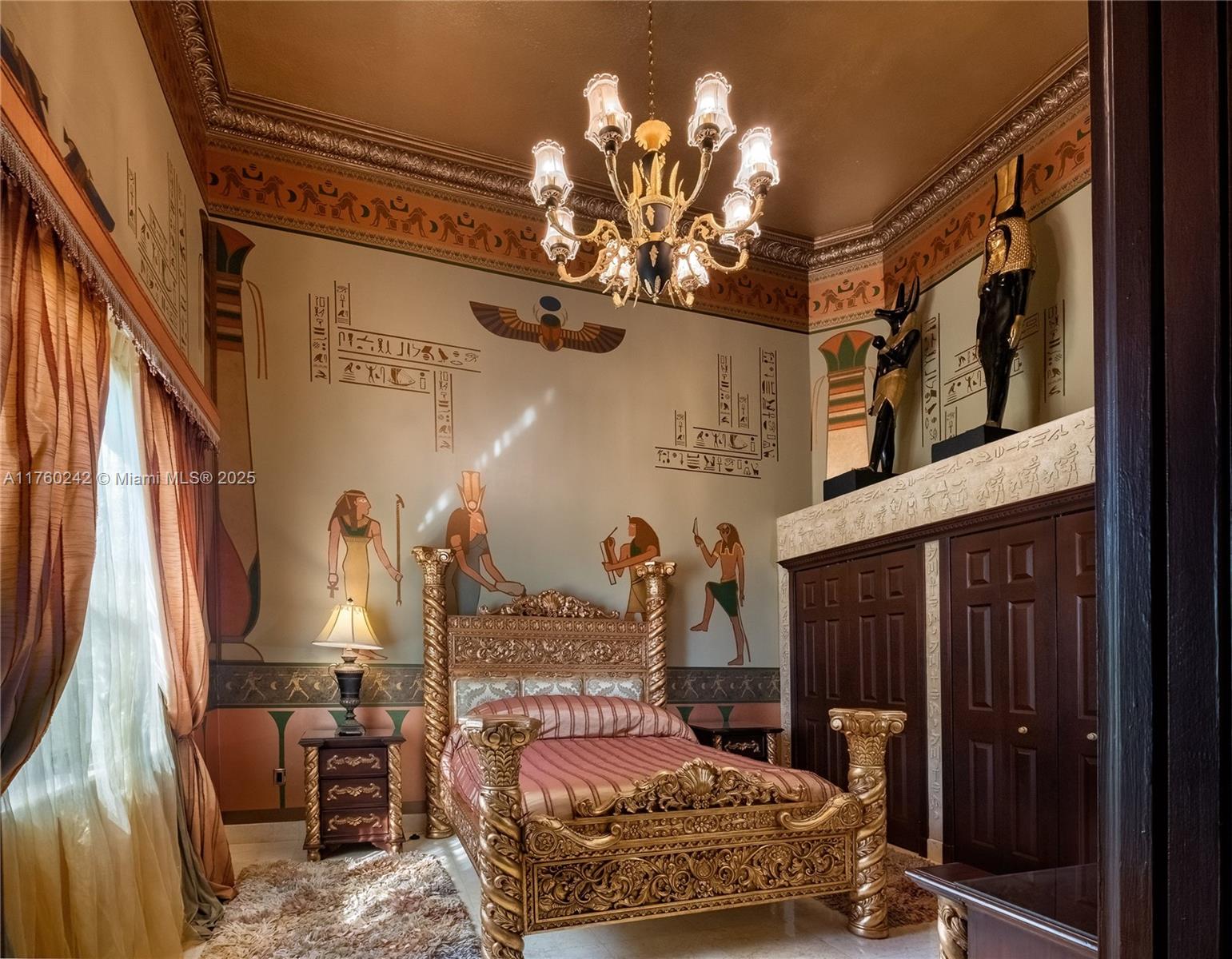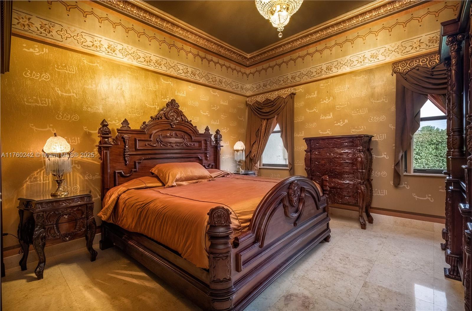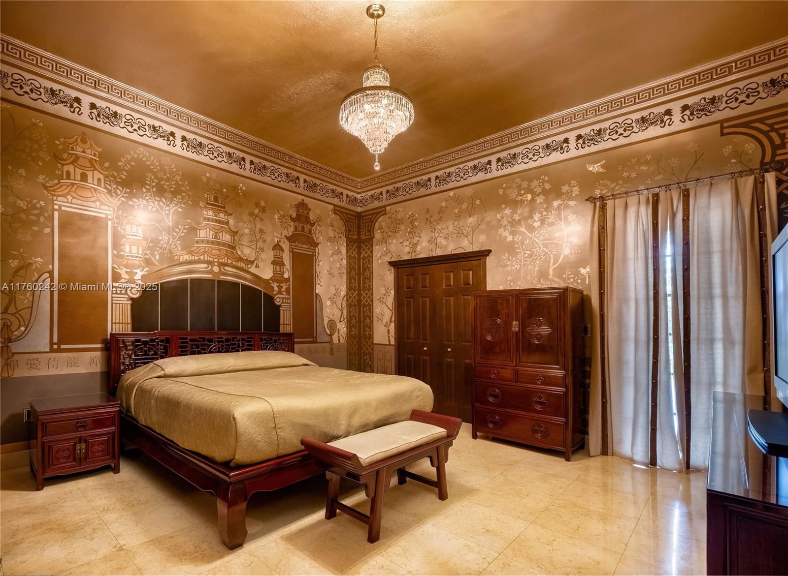 Discover a masterpiece in the Redlands! This exquisite estate features custom iron gates, a grand porte-cochere, and lush palm-lined landscaping. Inside, soaring ceilings, custom millwork, and hand-painted walls by a commissioned artist create a one-of-a-kind ambiance. Lavish window treatments, Birdseye Maple cabinetry, and opulent chandeliers, some 18K gold-plated, enhance its elegance. Offered fully furnished, this home boasts a screened lanai, lush gardens, and a sparkling pool—perfect for entertaining. A rare opportunity to own a true work of art!