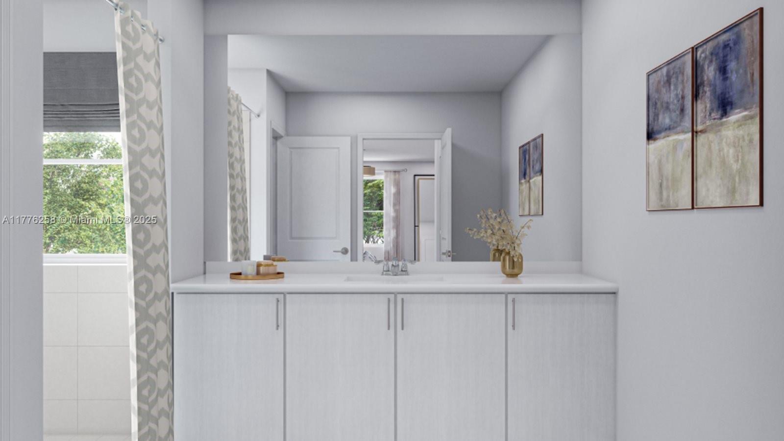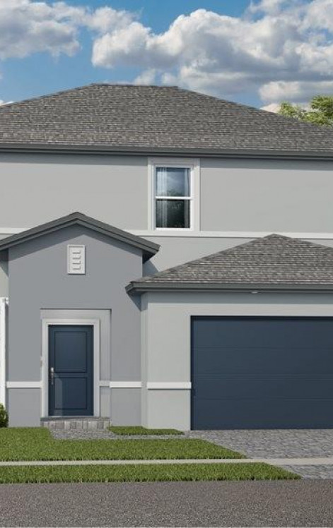 Upon entry of this spacious two-story home with impact-resistant windows is a living room ideal for entertaining guests, followed by the kitchen, family room and dining room arranged in a desirable open floorplan that promotes seamless transitions between spaces. A first-floor bedroom is well-suited for versatile uses and the remaining four bedrooms occupy the second floor, including the luxe owner’s suite with a spa-inspired bathroom.