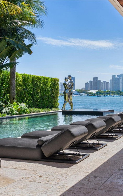 RARE VENETIAN ISLANDS TROPICAL MODERN WATERFRONT ESTATE WITH DIRECT DOWNTOWN MIAMI CITY SKYLINE VISTAS OVER THE BAY ON THE COVETED SOUTH-SIDE OF SAN MARINO ISLAND! Stunning Bayfront Residence Perched on OVERSIZED 15,750SF LOT & A HALF with 90FT of Waterfrontage. Multi-Vessel IPE Dock w/Lift & Jet Ski platforms. 5 Large Suites each with Ensuite Baths + 2 Powder Rooms + Office + Family Room. Theater w/Surround Sound & Lounging Beds. Open modern floor plan, wrapped by 10 FT Telescopic Fleetwood Glass Doors, provides Seamless Indoor/Outdoor Living. Blonde Oak Floors & Gourmet Eat-in Kitchen with Gas Range & Stainless Steel Miele Appliances sits adjacent to Catering Kitchen with Pantry & Separate Service Entrance. Comfortable Breakfast Area, Wine Room & Bar. Spacious Primary Suite draped by Panoramic Sunsets over Miami Skyline with two dressing rooms + Bookmatched Marble Bath with Rain Shower & Deep Soaking Tub. Wraparound Terraces in Keystone with Stairs lead to an Expansive Rooftop Entertaining Area—Ample Green Space with Architectural Dark Bottom Negative-edge Pool & Spa. Modern Gazebo includes a Chef’s Summer Kitchen + Cabana Bath. Privacy Gate + 2 Car Garage.