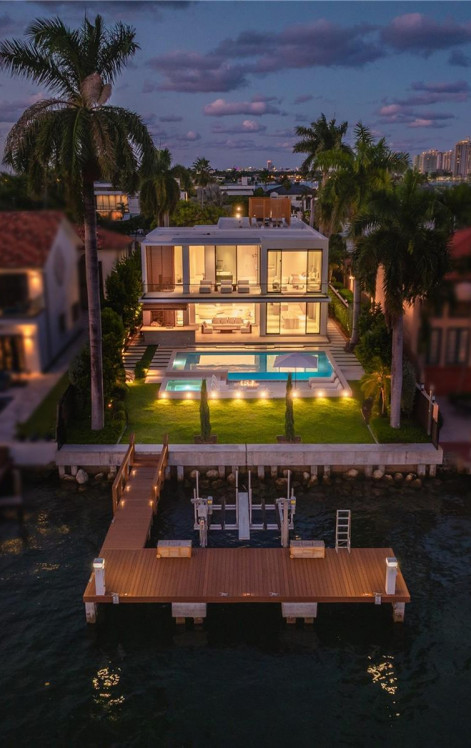Modern waterfront retreat on gated Hibiscus Island, this residence blends architectural drama with refined comfort & wellness-driven design. Beyond a 23ft steel entry, light-filled living spaces open through telescopic glass walls to sweeping skyline views & spectacular sunsets. The great room centers on a stone fireplace, while the chef’s kitchen features marble & fluted oak finishes, cooking island, illuminated wine wall, Tyent hydrogen system & Control4 automation. Upstairs, a floating staircase leads to 4 beds, including a primary suite with dual lounges, custom dressing room & a spa bath with cold plunge & UV sauna. Outdoors, southern exposure sets a resort tone with a sleek pool & spa, covered lounge, summer kitchen, sunken firepit, 60' of water frontage & reverse-osmosis filtration