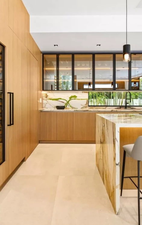 At the heart of the home, a showpiece kitchen features imported Italian porcelain slab countertops, a bold waterfall island, custom cabinetry, integrated wine storage, and a premium Sub-Zero appliance package.