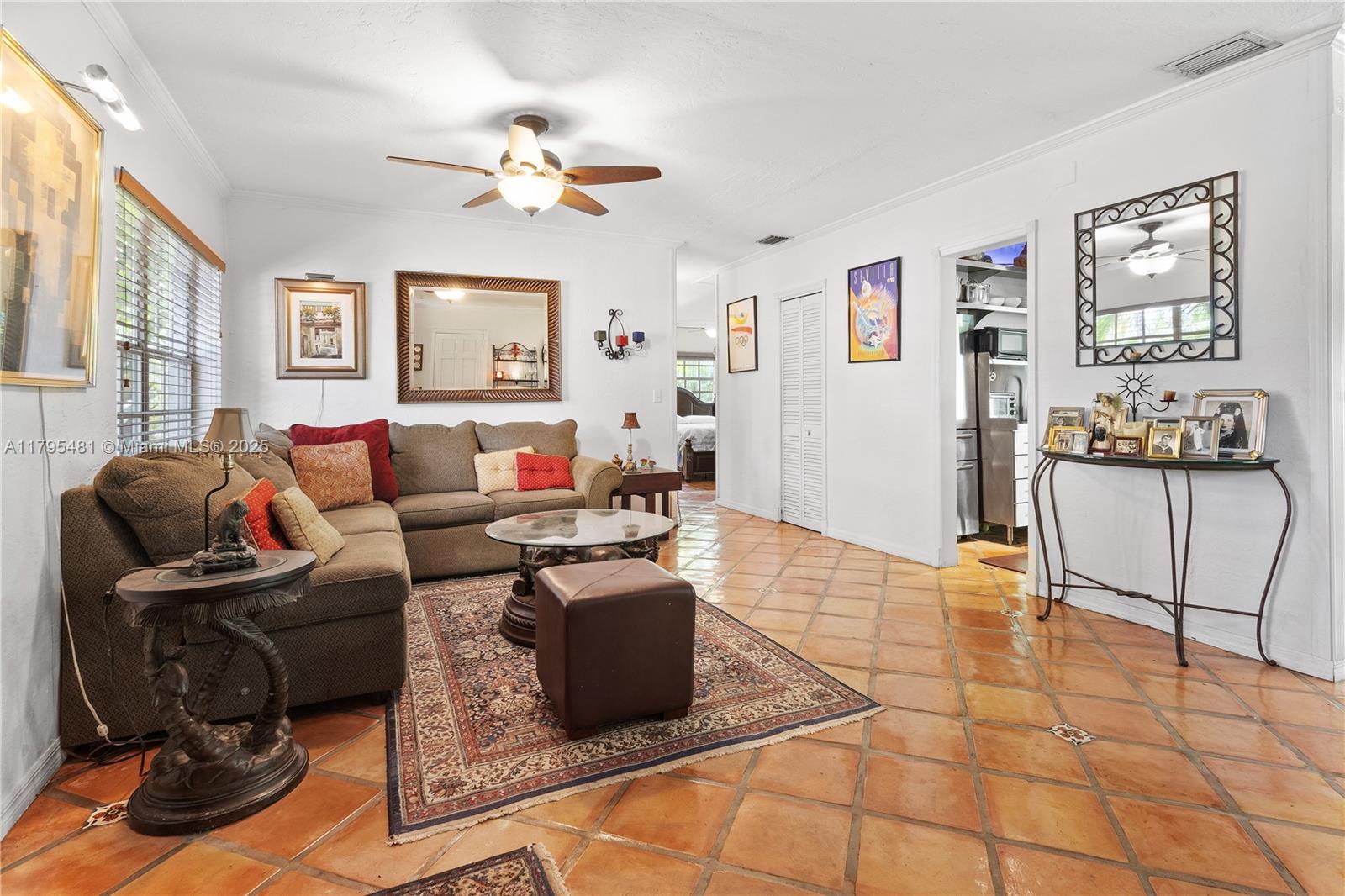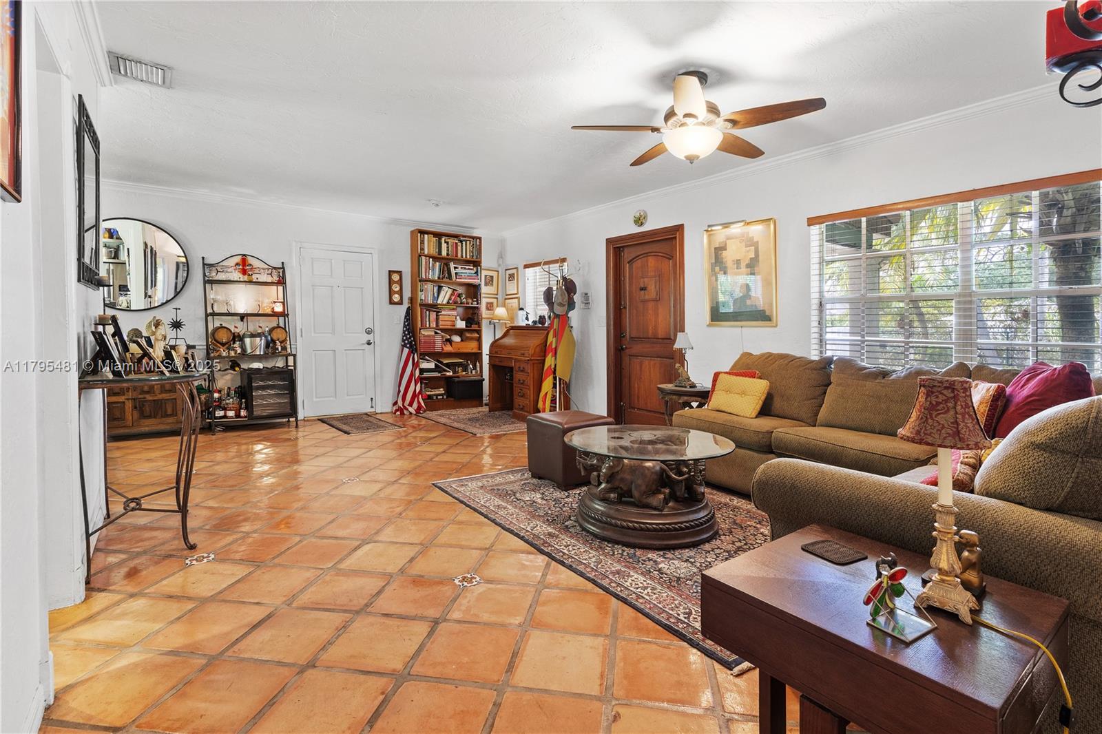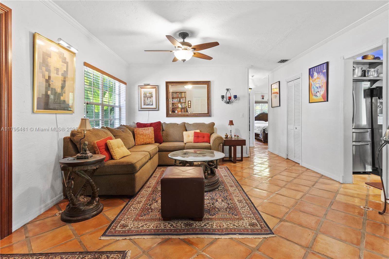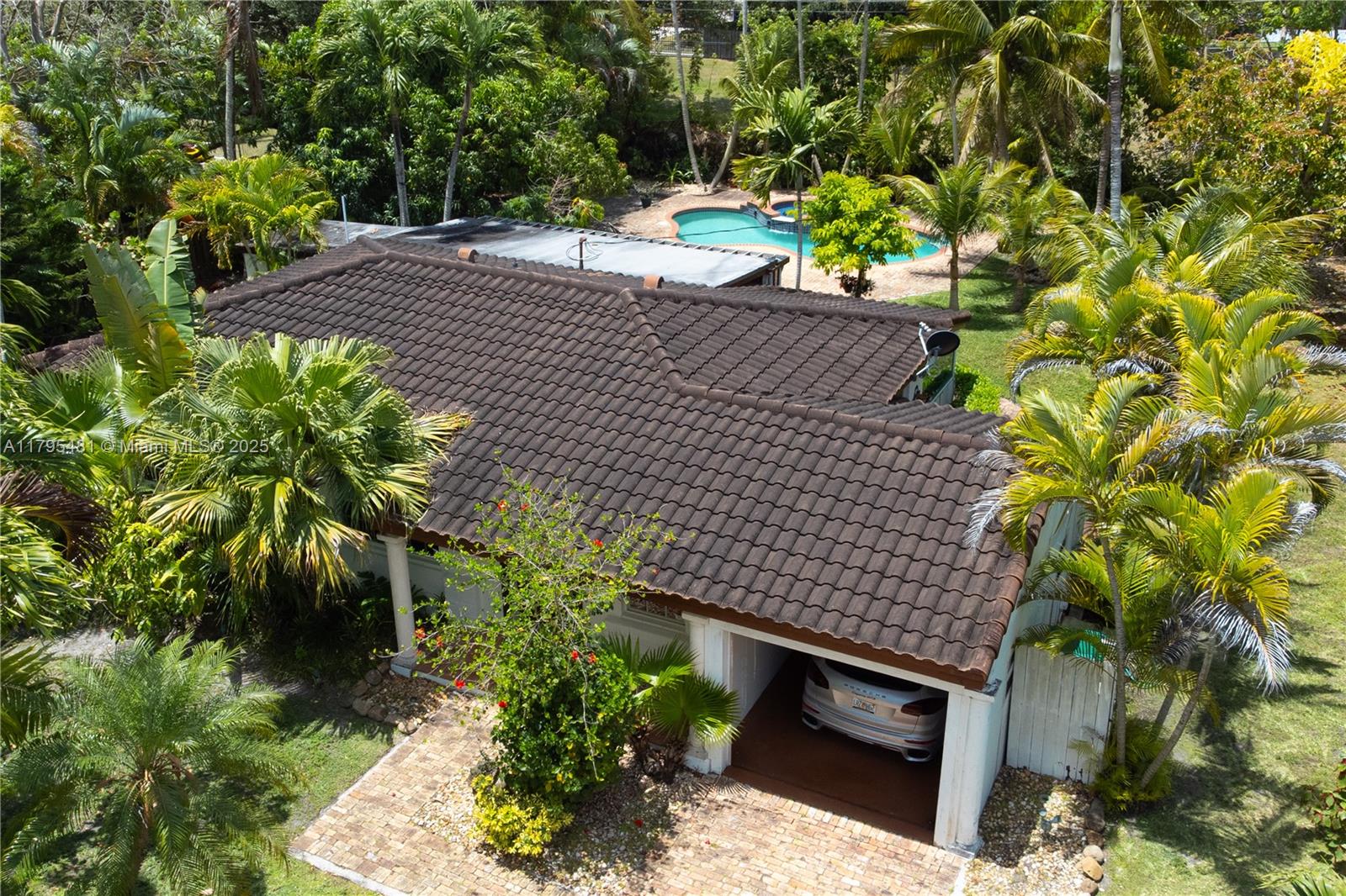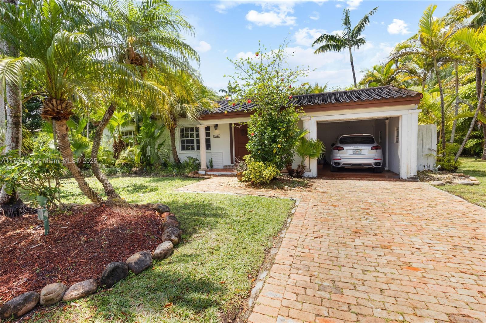 New to market comes this quintessential South Miami home w/gated entrance & fully landscaped lot. Located in the sought after community of Glenvar Heights & set on over 1/3 of acre, this home features 3 bedrooms (3rd bedroom converted into den) & 2 bathrooms, in-ground pool & spa w/ new pump. Tropical landscaping w/ professional lighting, automatic sprinklers with well, mango/coconut fruit trees & queen/ king palms! Chicago pavers in driveway & patio + a 1 car garage. Inside features Saltillo floors & a custom built stainless steel Chefs kitchen, newer washer/dryer. The exterior features a screened lanai, gas outdoor kitchen, stainless steel bbq, pool, spa, cabana bath w/ shower & shed w/ electricity. The home is storm protected by impact windows/doors & aluminum shutters.