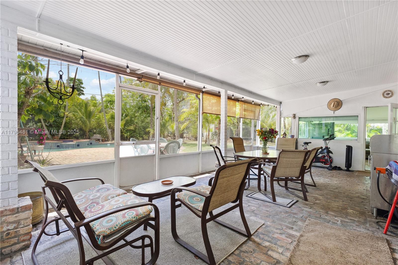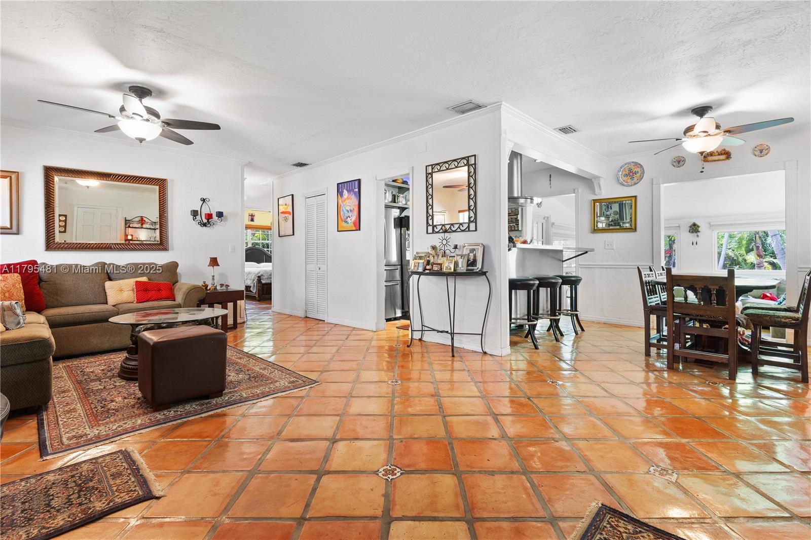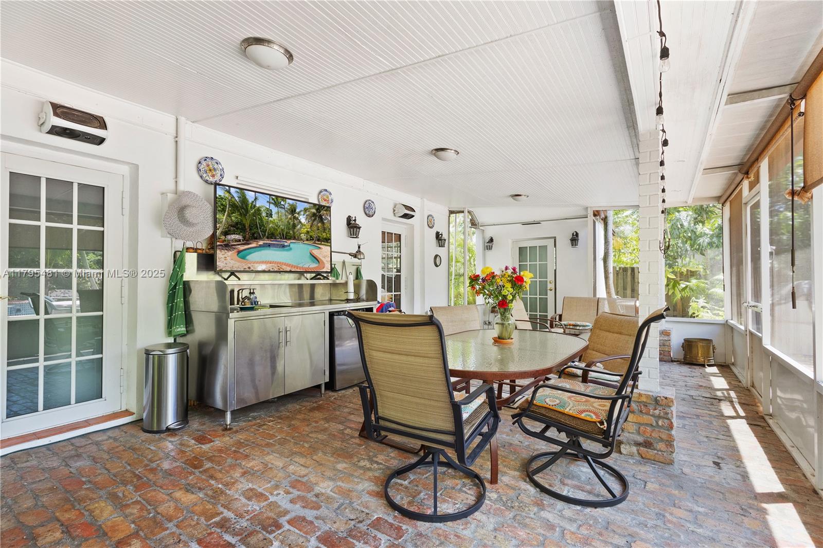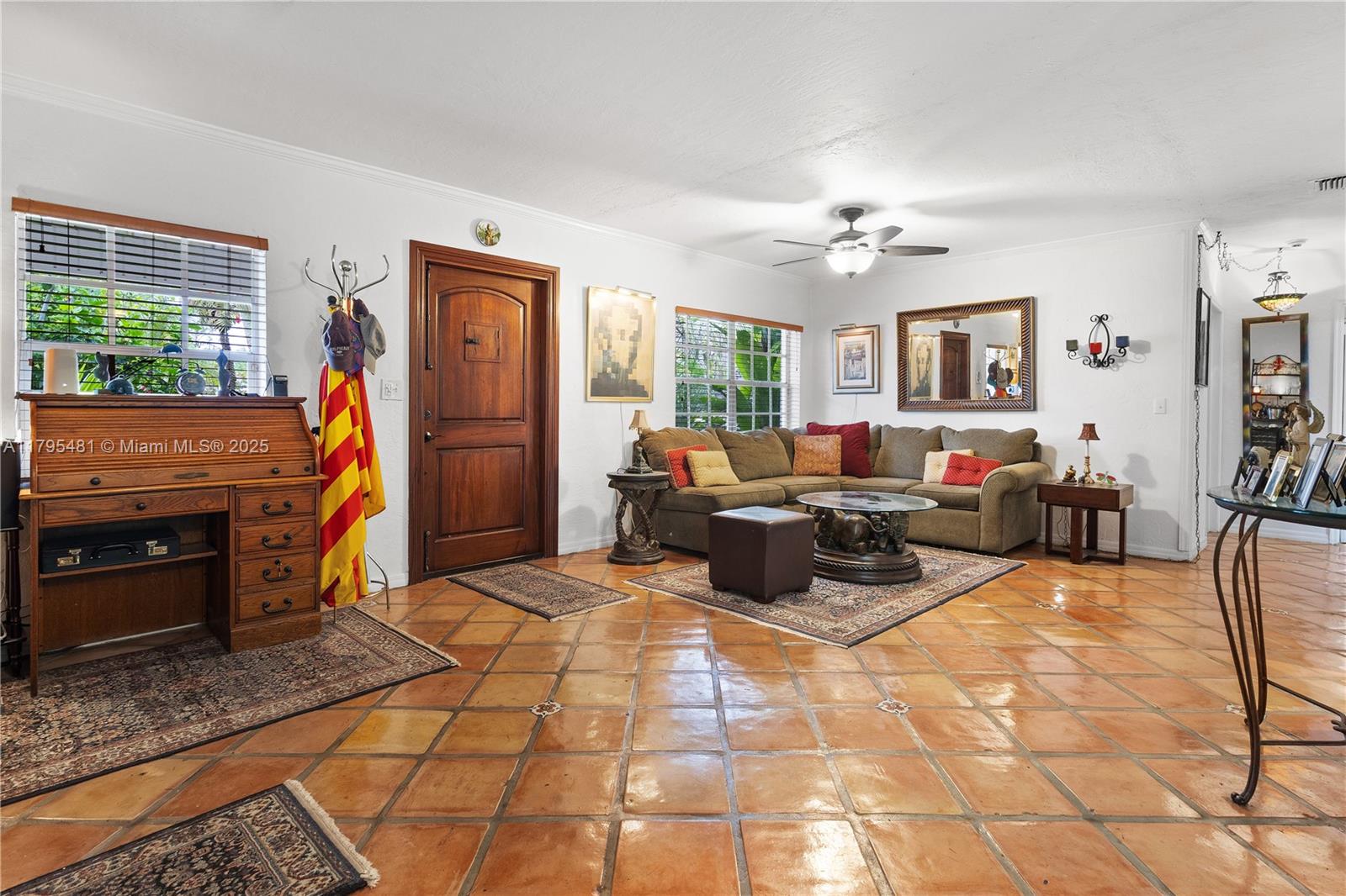 New to market comes this quintessential South Miami home w/gated entrance & fully landscaped lot. Located in the sought after community of Glenvar Heights & set on over 1/3 of acre, this home features 3 bedrooms (3rd bedroom converted into den) & 2 bathrooms, in-ground pool & spa w/ new pump. Tropical landscaping w/ professional lighting, automatic sprinklers with well, mango/coconut fruit trees & queen/ king palms! Chicago pavers in driveway & patio + a 1 car garage. Inside features Saltillo floors & a custom built stainless steel Chefs kitchen, newer washer/dryer. The exterior features a screened lanai, gas outdoor kitchen, stainless steel bbq, pool, spa, cabana bath w/ shower & shed w/ electricity. The home is storm protected by impact windows/doors & aluminum shutters.