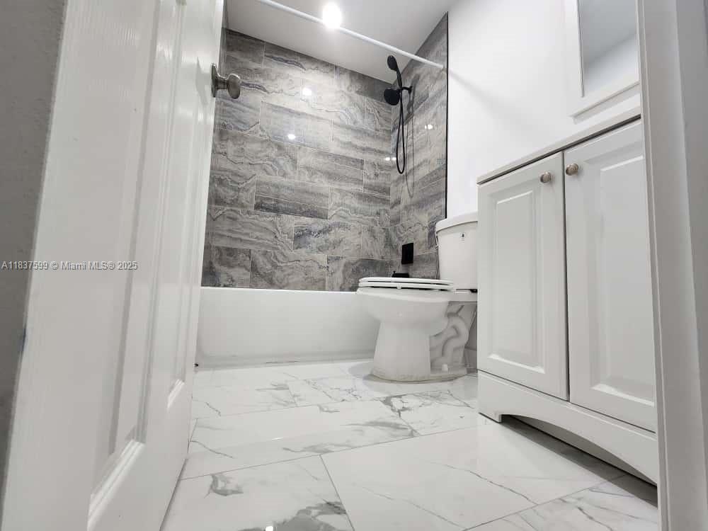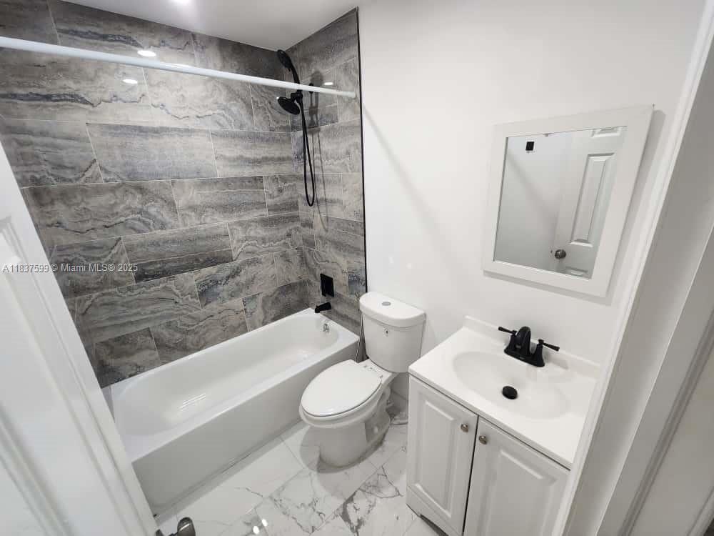 All three bedrooms offer generous closet space and natural light, while the fully renovated bathroom includes a sleek vanity, contemporary fixtures, and a tiled shower/tub combo.