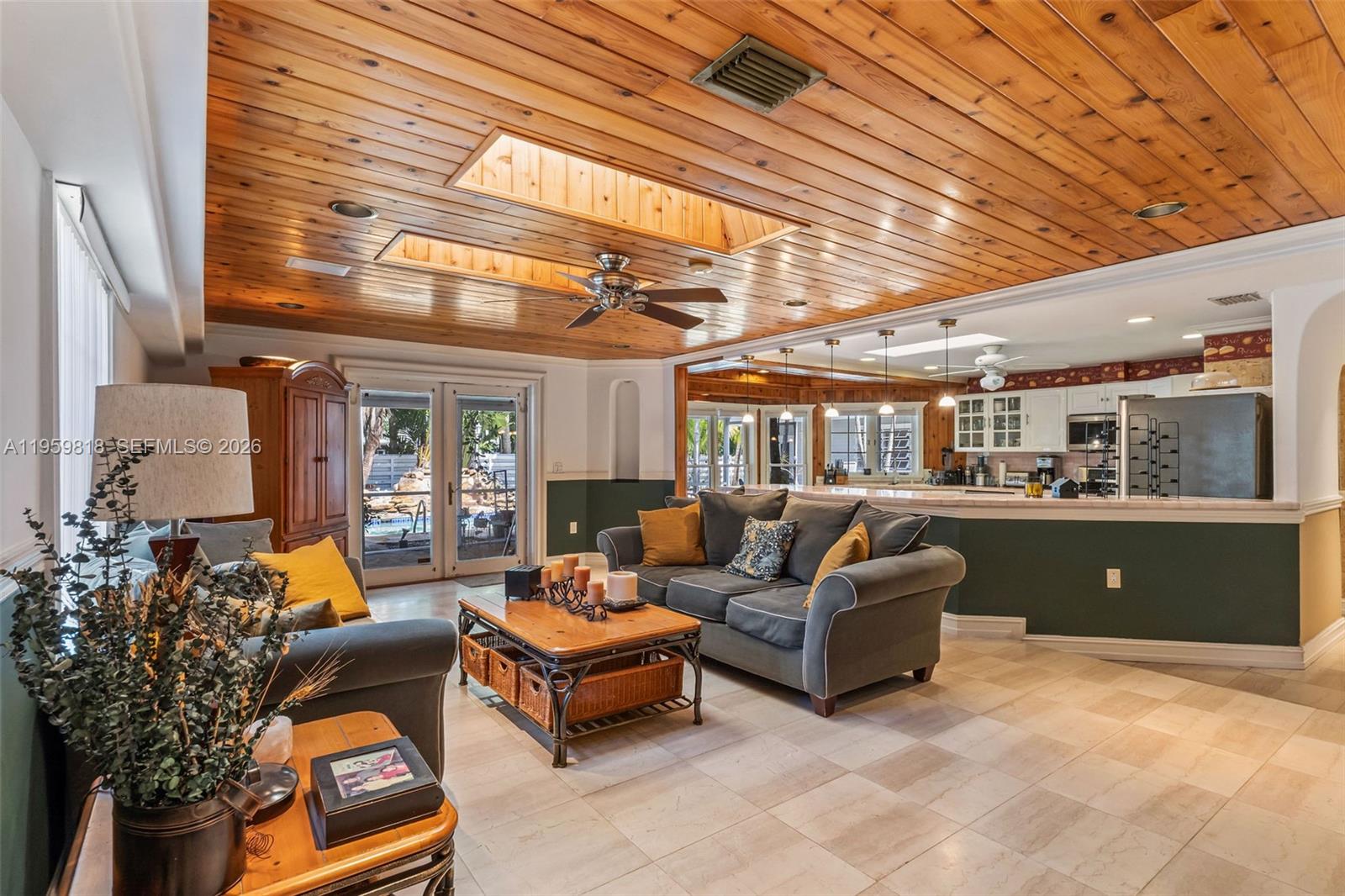 The interior is warm and elevated, featuring sealed pine wood ceilings throughout, ambient lighting, and skylights that flood the home with natural light. A spacious kitchen anchors the home, while a screened outdoor terrace invites effortless entertaining. The primary suite offers a private wellness retreat with an expansive adjoining spa area featuring an integrated sauna, jacuzzi, full bathroom, and dedicated split A/C unit.