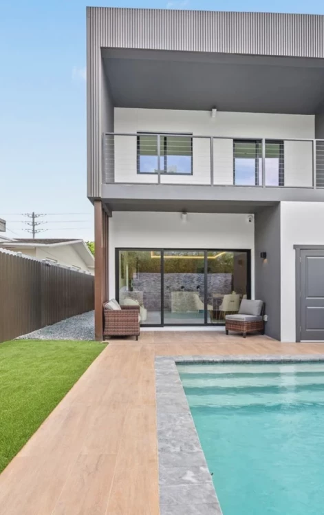 The outdoor space is designed for entertaining, complete with a saltwater heated pool, WiFi-controlled spa jets, a Coyote summer kitchen, and a Spanish porcelain Augusta pool deck. Additional highlights include Masonite fiberglass entry doors, soft-closing garage doors, and an extensive drainage system for added peace of mind.