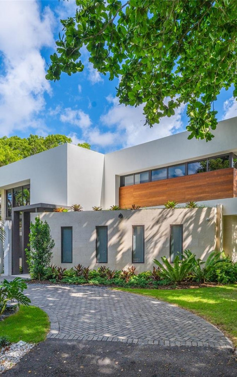 This luxurious 5-bedroom, 6-bath Florida Modern residence boasts over 5,500 square feet of elegantly designed indoor and outdoor living space, nestled among lush tropical landscaping for ultimate privacy and tranquility. Floor-to-ceiling windows bathe the interiors in natural light, highlighting an open-concept layout that effortlessly blends indoor sophistication with outdoor serenity—ideal for entertaining. A dramatic dining area with soaring 22-foot ceilings and a striking floating staircase sets the tone for the home’s impressive design. The impeccably curated Armazem kitchen—with a custom wine cellar—flows into a spacious great room that opens to a covered poolside terrace featuring a fully equipped outdoor kitchen with an icemaker.