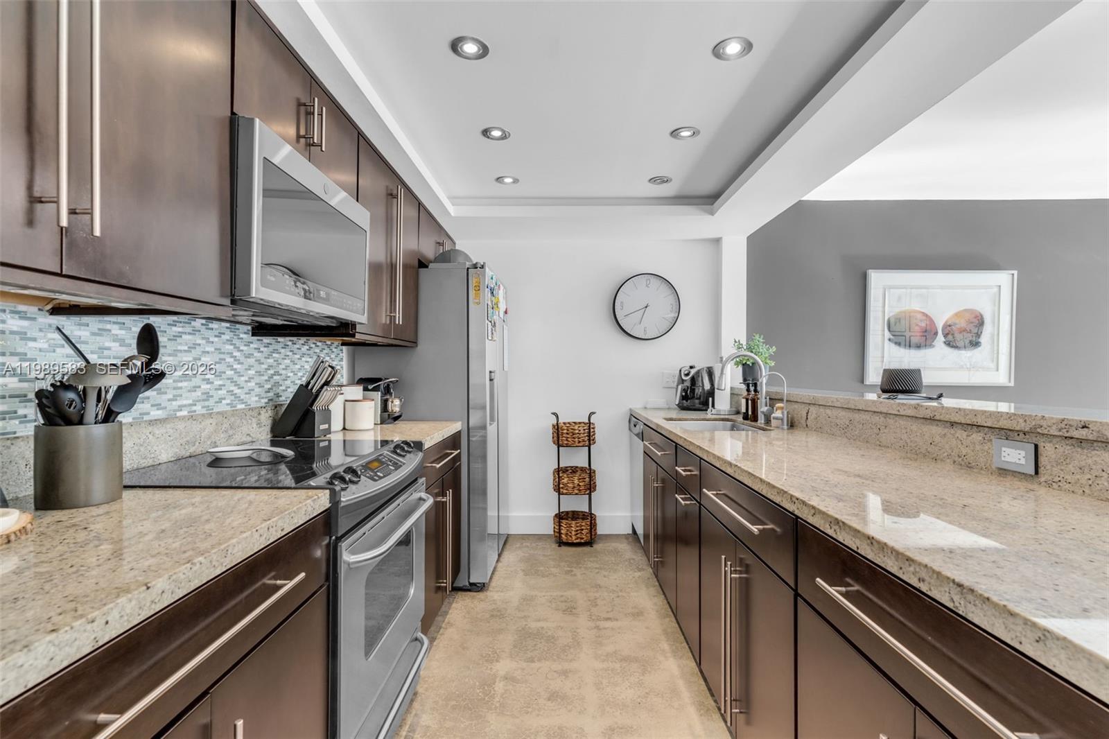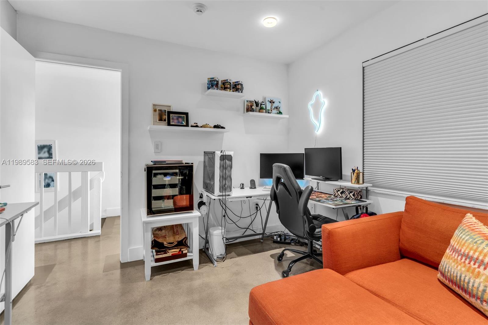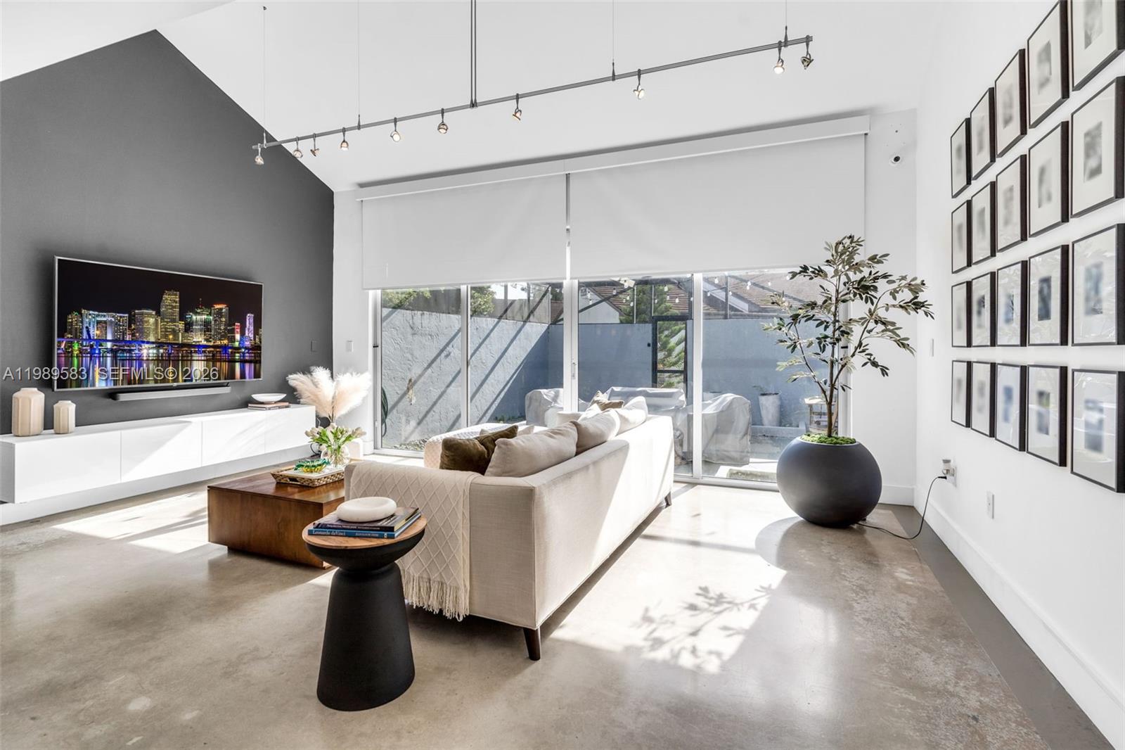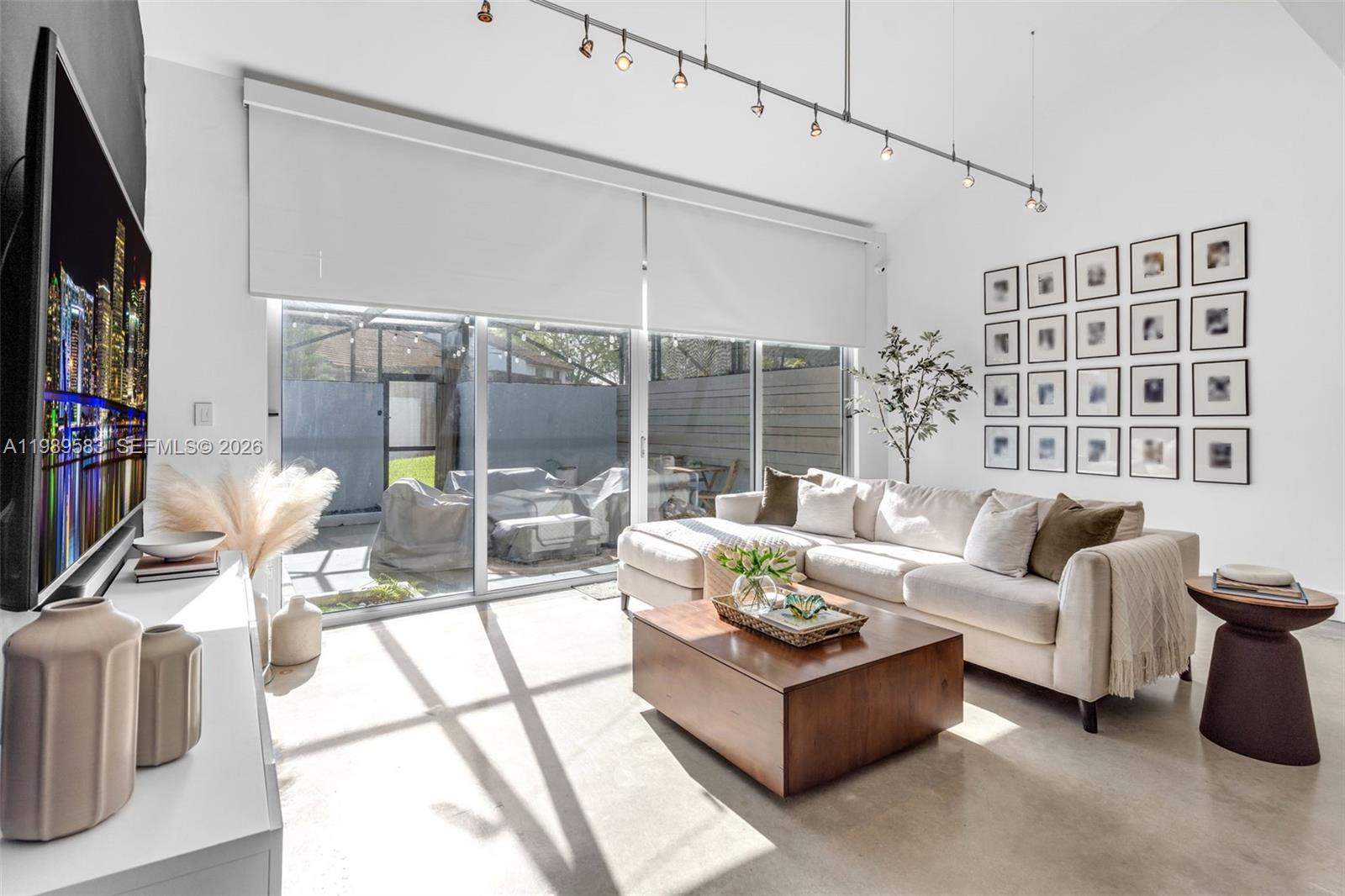 The home features high ceilings, tons of natural light, and a clean, modern feel with warm touches throughout. The kitchen opens right into the living space, and large sliding doors lead out to a private patio, giving you that indoor-outdoor lifestyle Miami living is all about.
