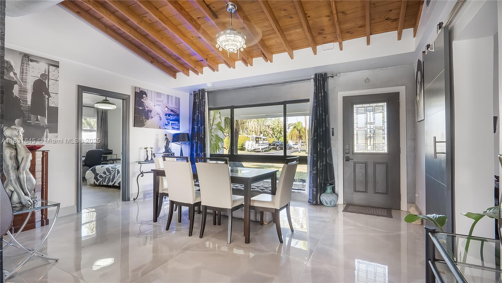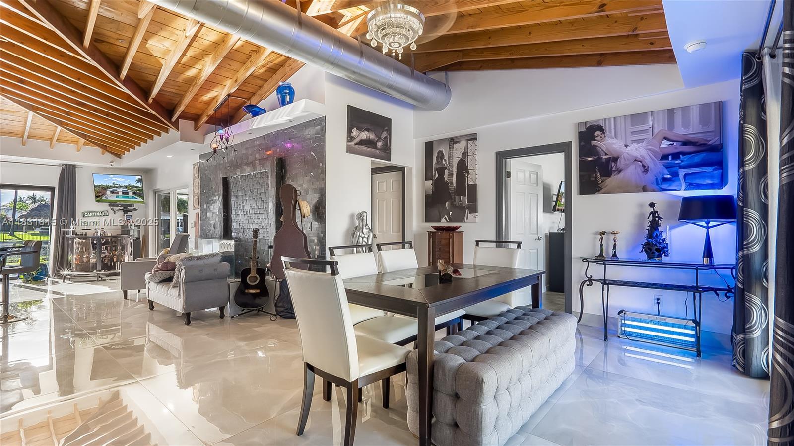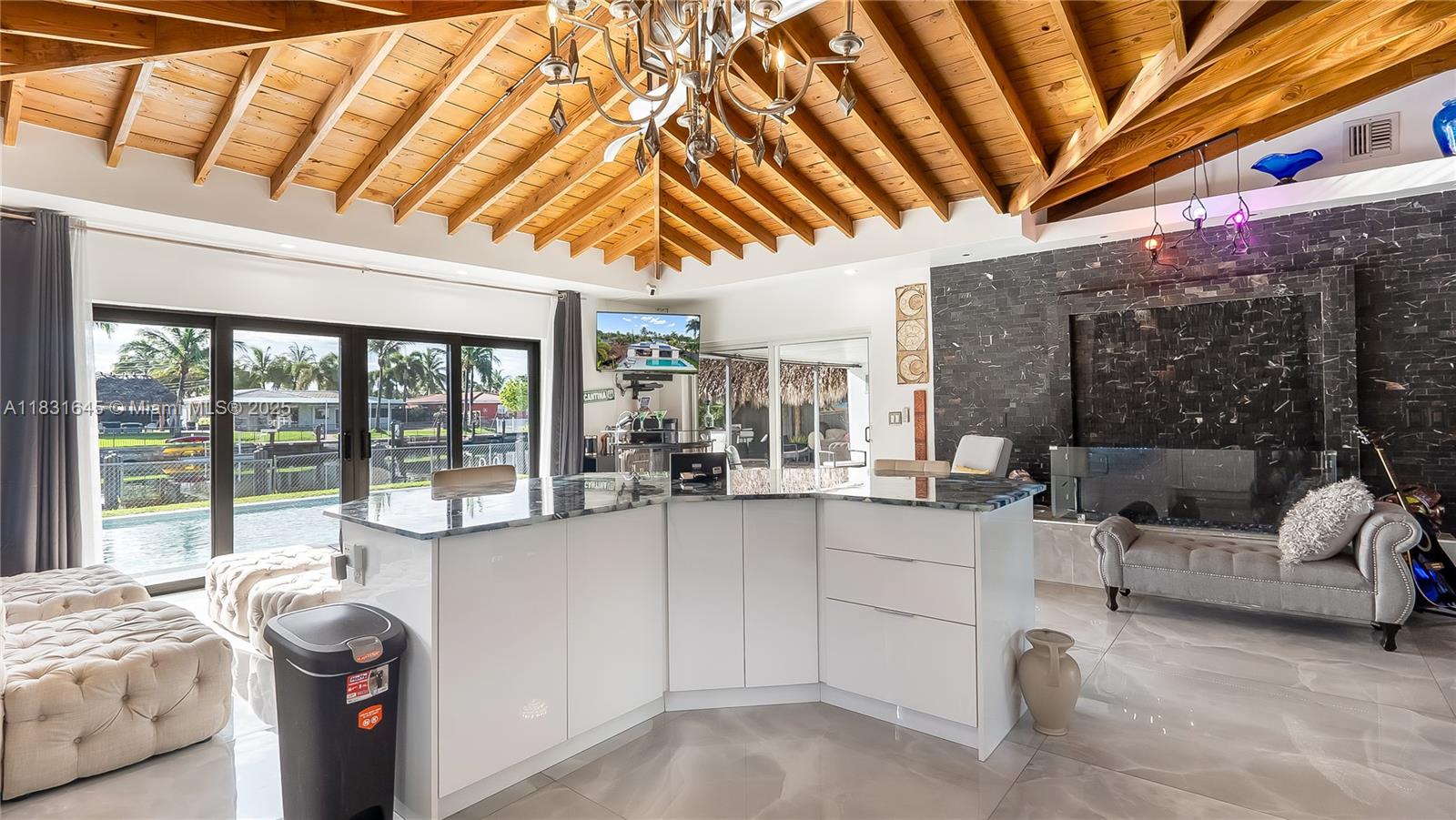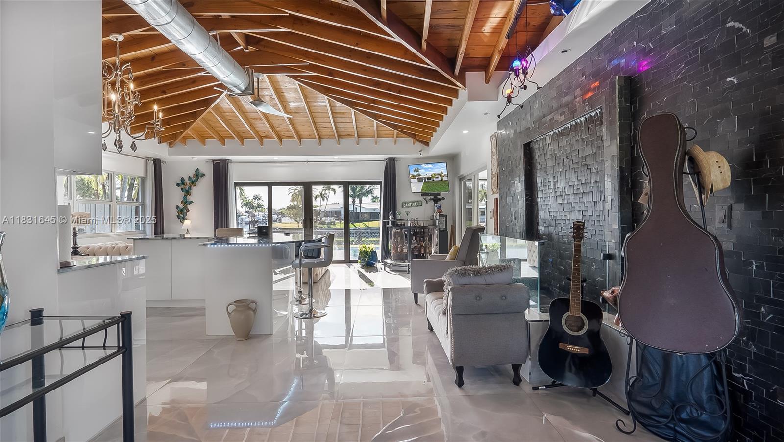 wood vaulted ceilings, large porcelain floors, an interior water wall, custom