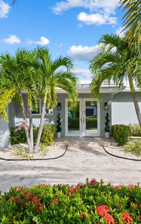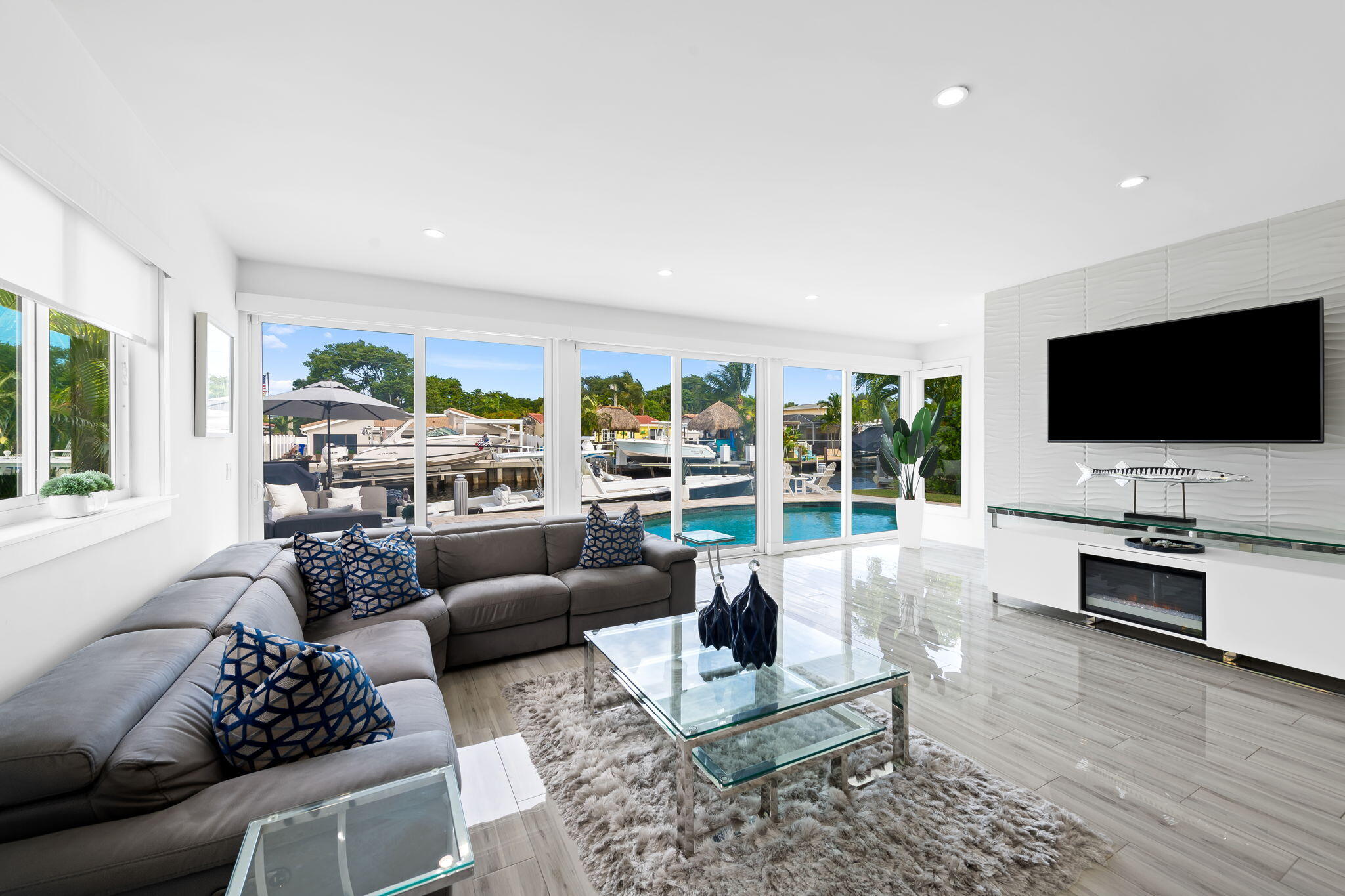 Welcome to this stunning waterfront retreat where modern design meets smart living. This fully furnished three-bedroom, two-bath home offers 70 feet of prime ocean-access waterfrontage with NO fixed bridges. Featuring a 60-foot dock with Hatteras brand duel light power pedestal 50/30 amps, water and solar dock lights and a sparkling resort-style pool surrounded by a travertine patio and lush tropical landscaping. Every detail has been thoughtfully curated for comfort and style, from the impact-rated windows and doors to the elegant half-circle driveway and fully fenced backyard that blend privacy with sophistication.Inside, a bright open layout features glossy polished white wood-plank ceramic tile, solid wood interior doors, and custom designer wall treatments. Freshly painted in