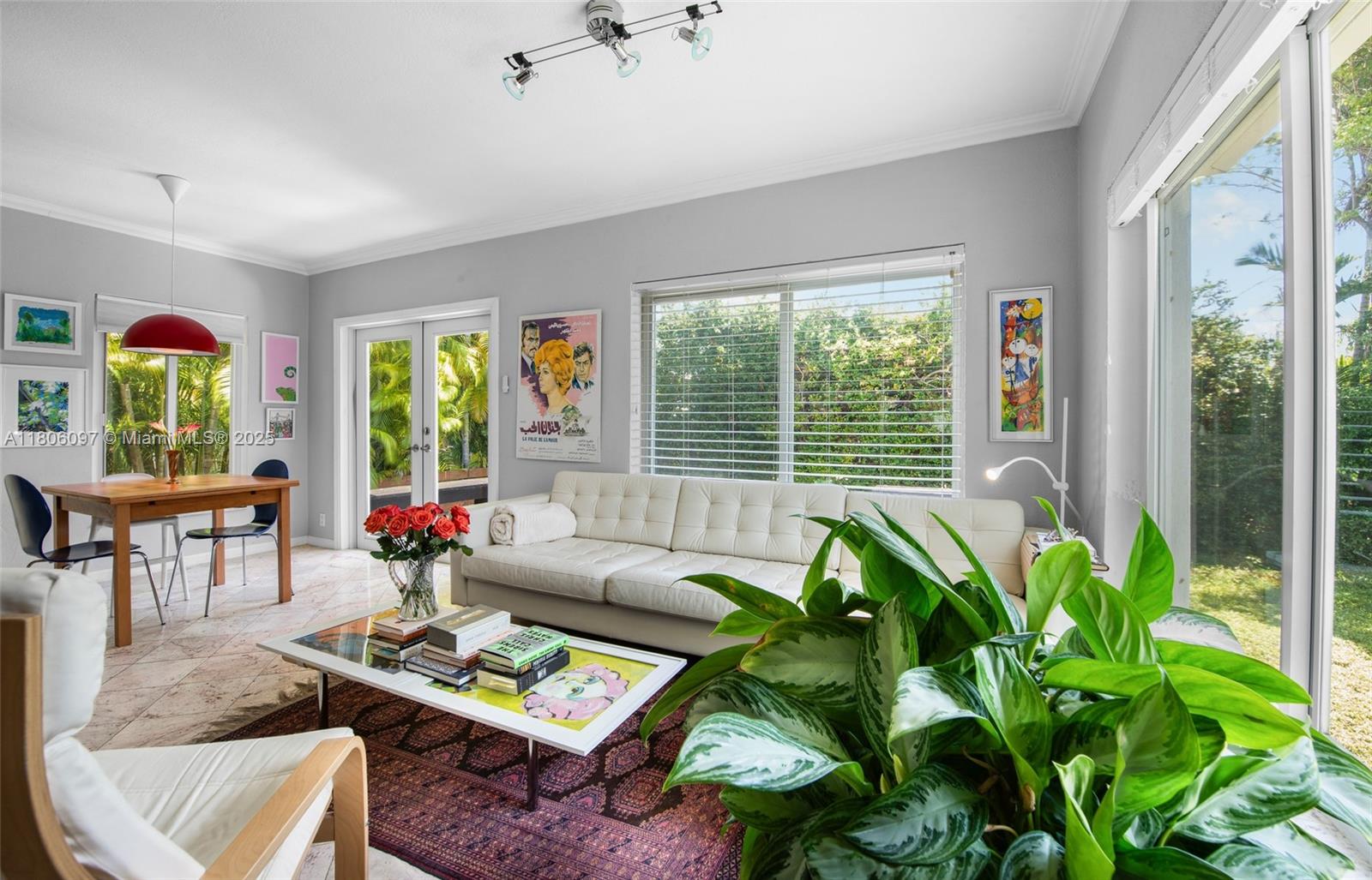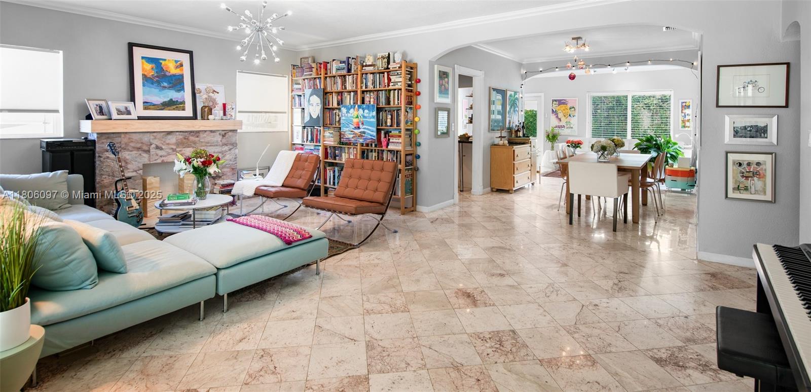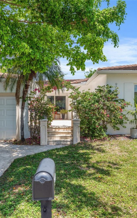 Enchanting & inviting midcentury modern home in quiet & desirable Surfside. This move-in-ready home has an ideal floor plan: charming entryway & front porch leads to an ample living room that flows into a dining room followed by a family room with breakfast nook, which leads out to an expansive wooden deck with retractable awning. The home features incredible natural light, energy-efficient impact windows & doors throughout, large patio with room for a pool, marble floors in living areas + wood floors in bdrms, split floor plan w/ 2 guest bdrms & 1 bath (w/ tub) separate from the primary bd suite w/ its own private office, 1-car garage, barrel & flat tile roof (installed 2015). Great for both quiet living & entertaining, and just blocks from the beach & many businesses, restaurants & shops