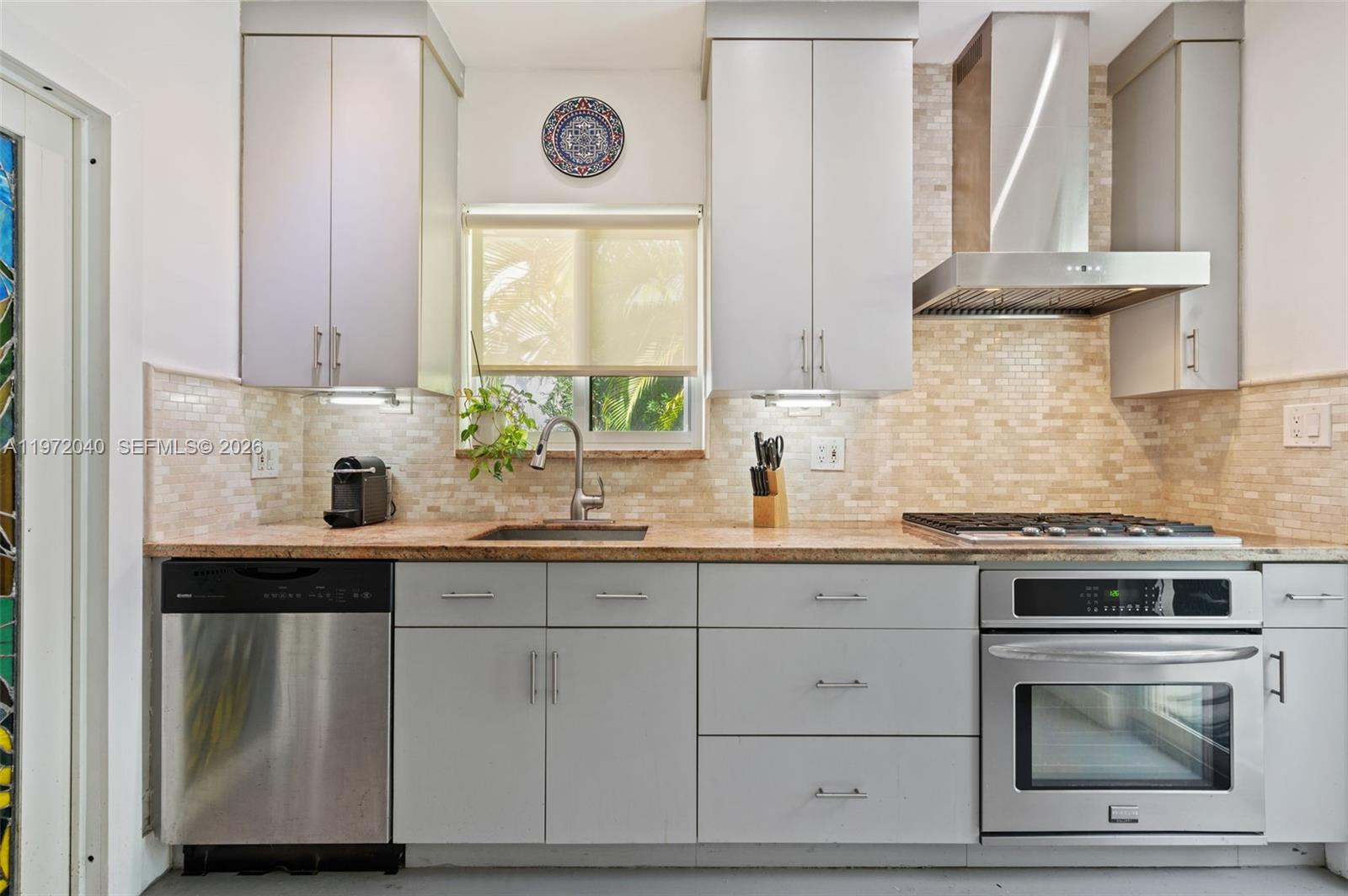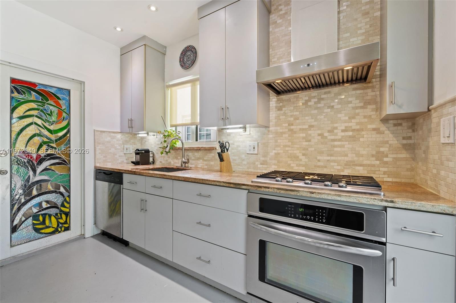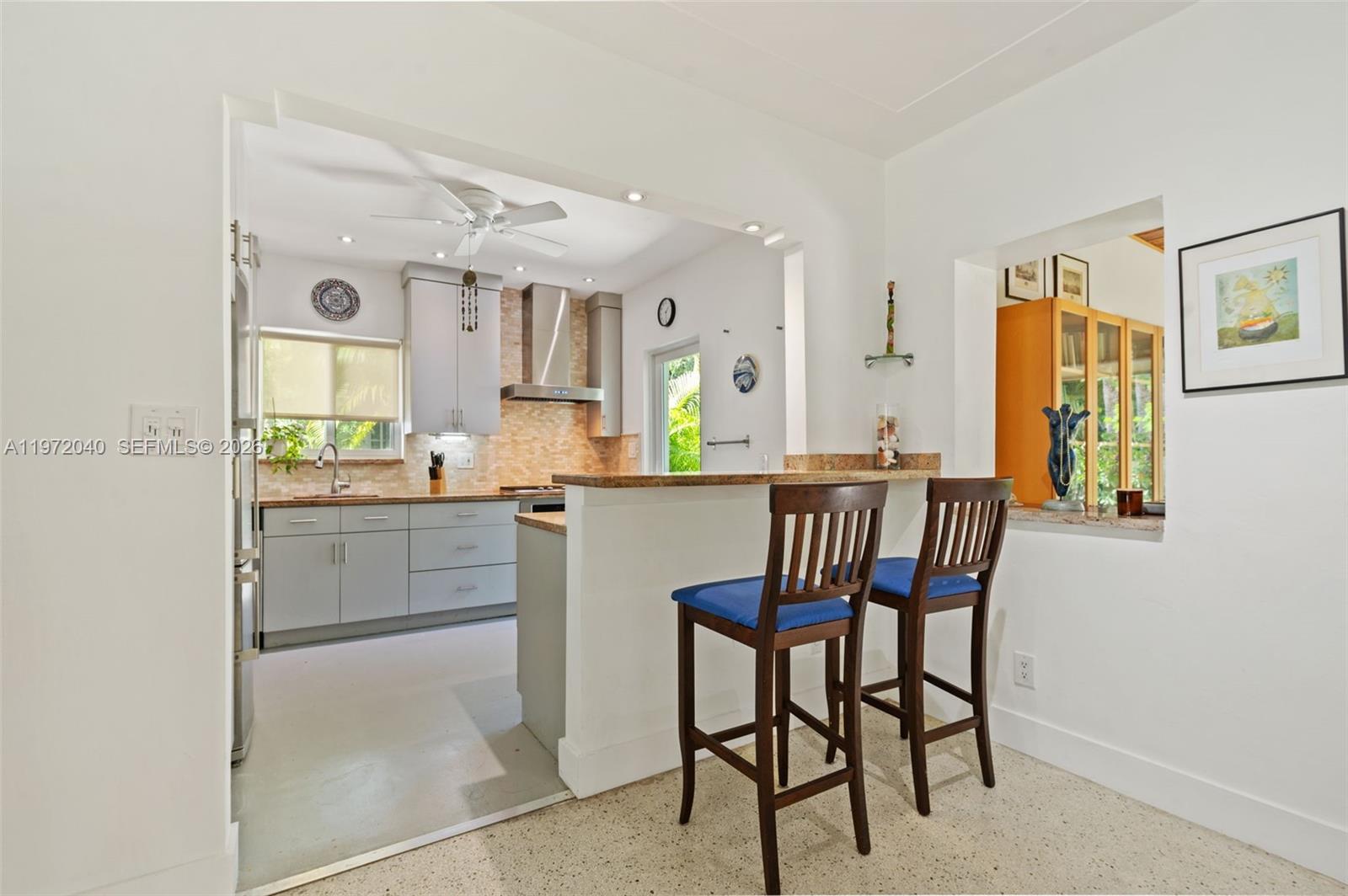 Highlights include original terrazzo floors, impact windows and doors, fully renovated bathrooms with floor-to-ceiling Italian porcelain tile, updated electrical wiring, a gas kitchen, and an attached one-car garage.