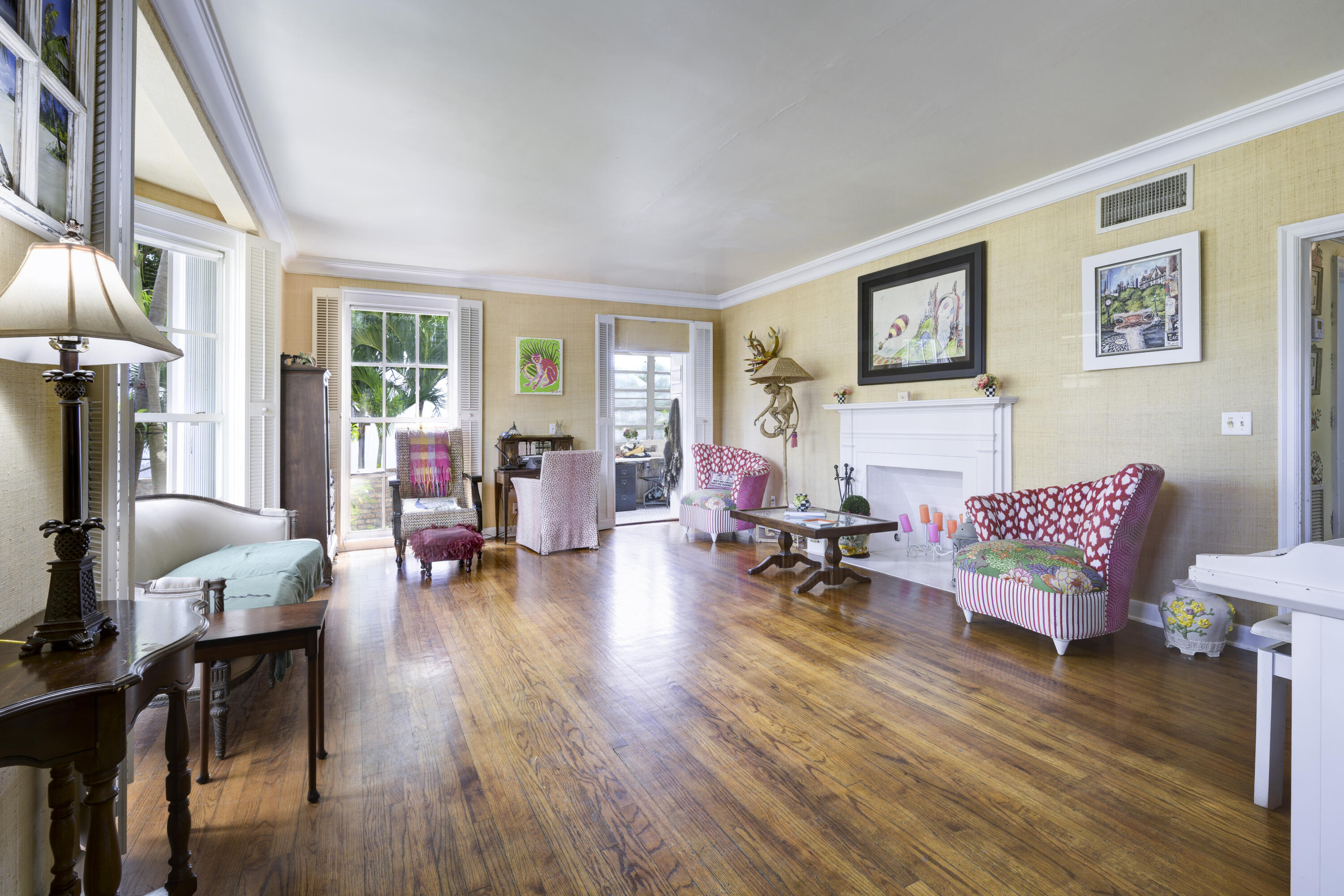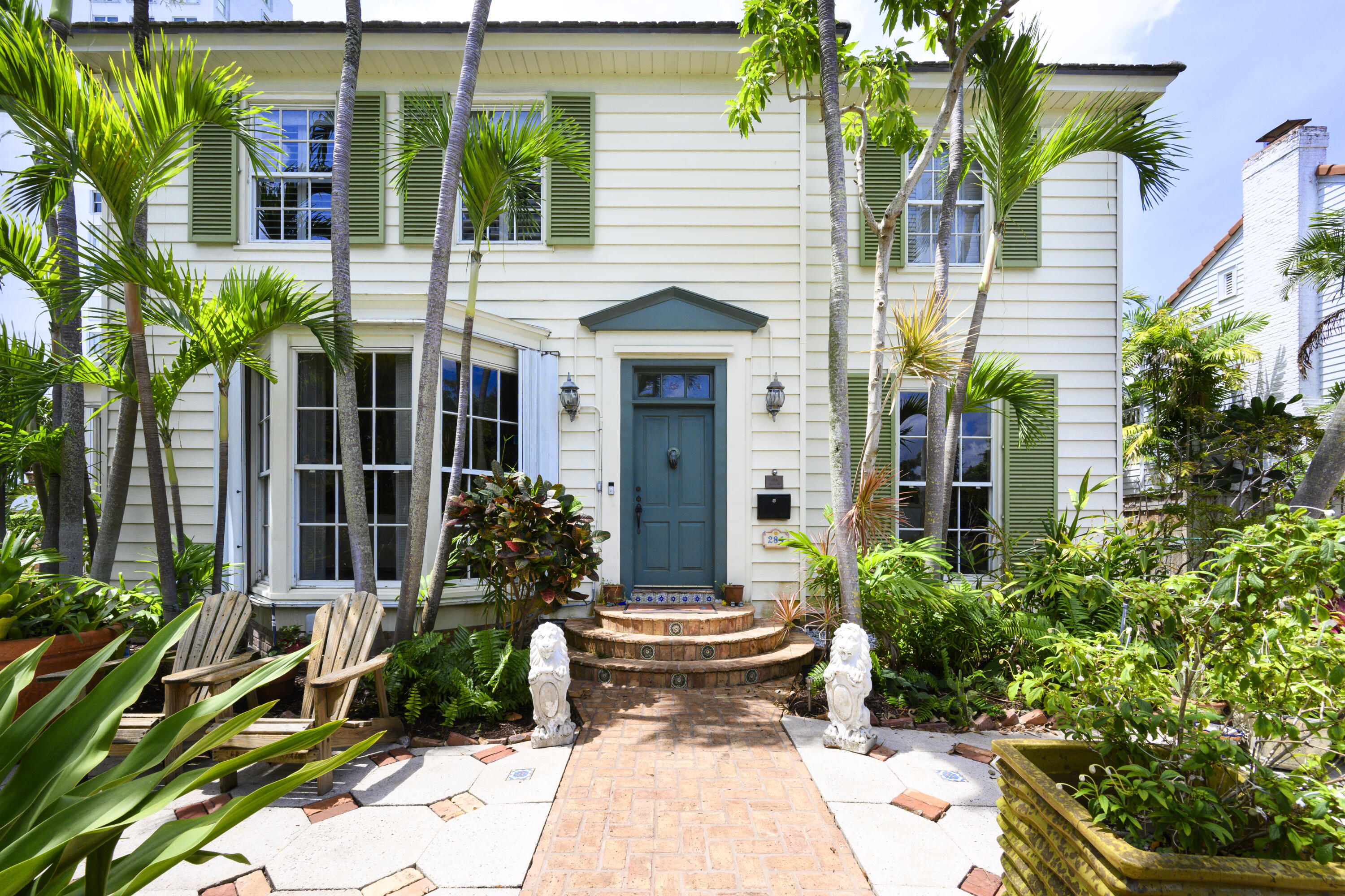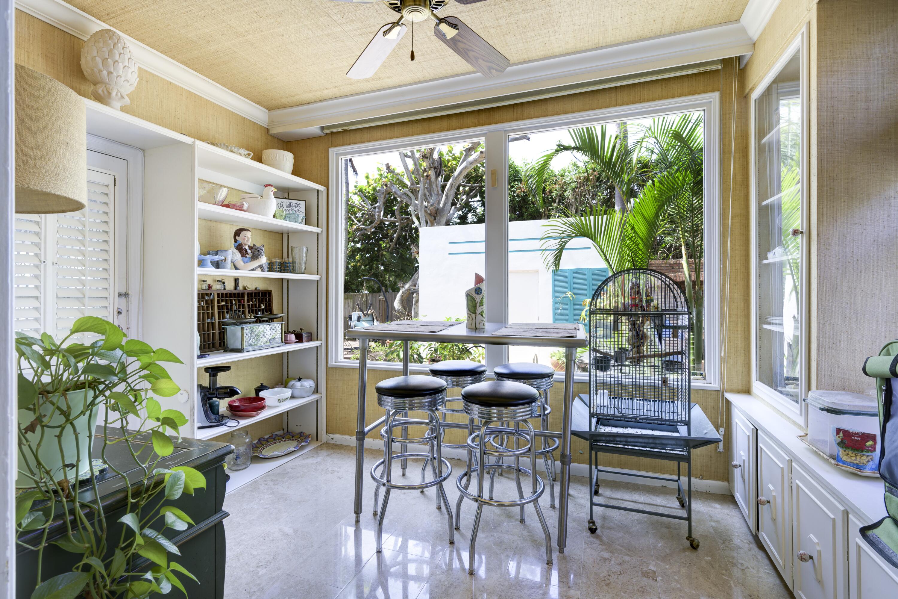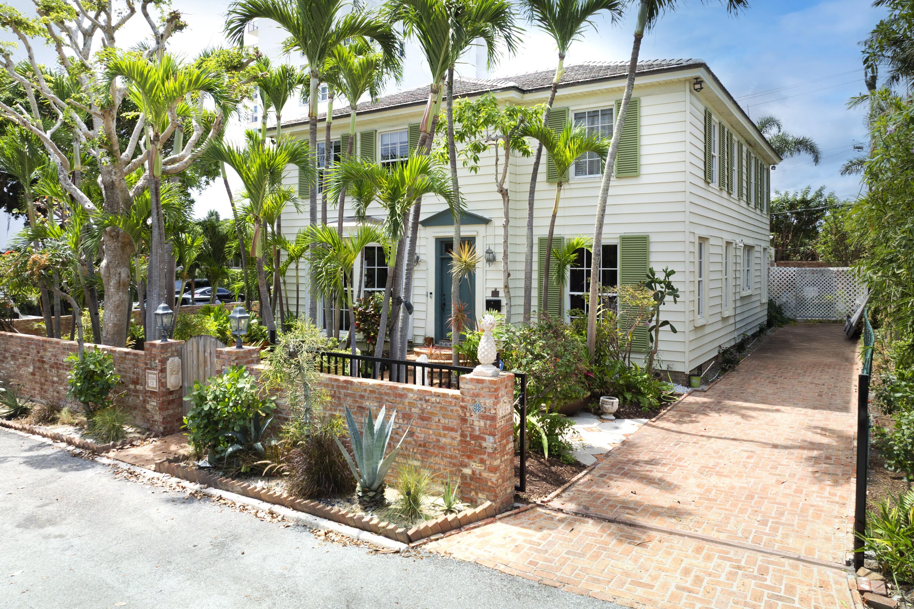 Timeless charm meets comfortable elegance in the heart of West Palm Beach. This Georgetown-style two-story pool residence blends timeless character with thoughtful upgrades, creating the perfect setting for relaxed living and effortless entertaining.Inside, Miami Dade Pine hardwood floors, elegant crown molding, and soaring 9-foot smooth ceilings set the tone. Custom built-ins offer both beauty and function throughout. Gather in the formal living room around the decorative fireplace or take in garden views from the bay window and adjacent home office. First floor features bedroom with wall-to-wall built-in shelving and pool view. Full downstairs bath with counter height vanity, tiled countertops imported from Bali, and a walk-in shower with glass doors and tiled flooring.