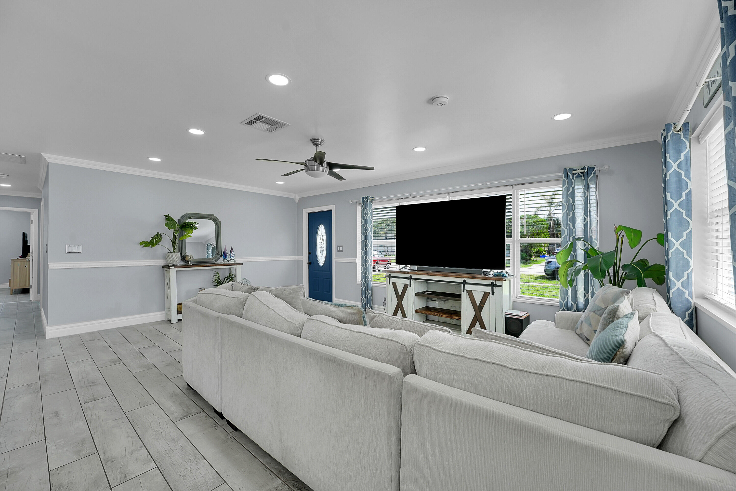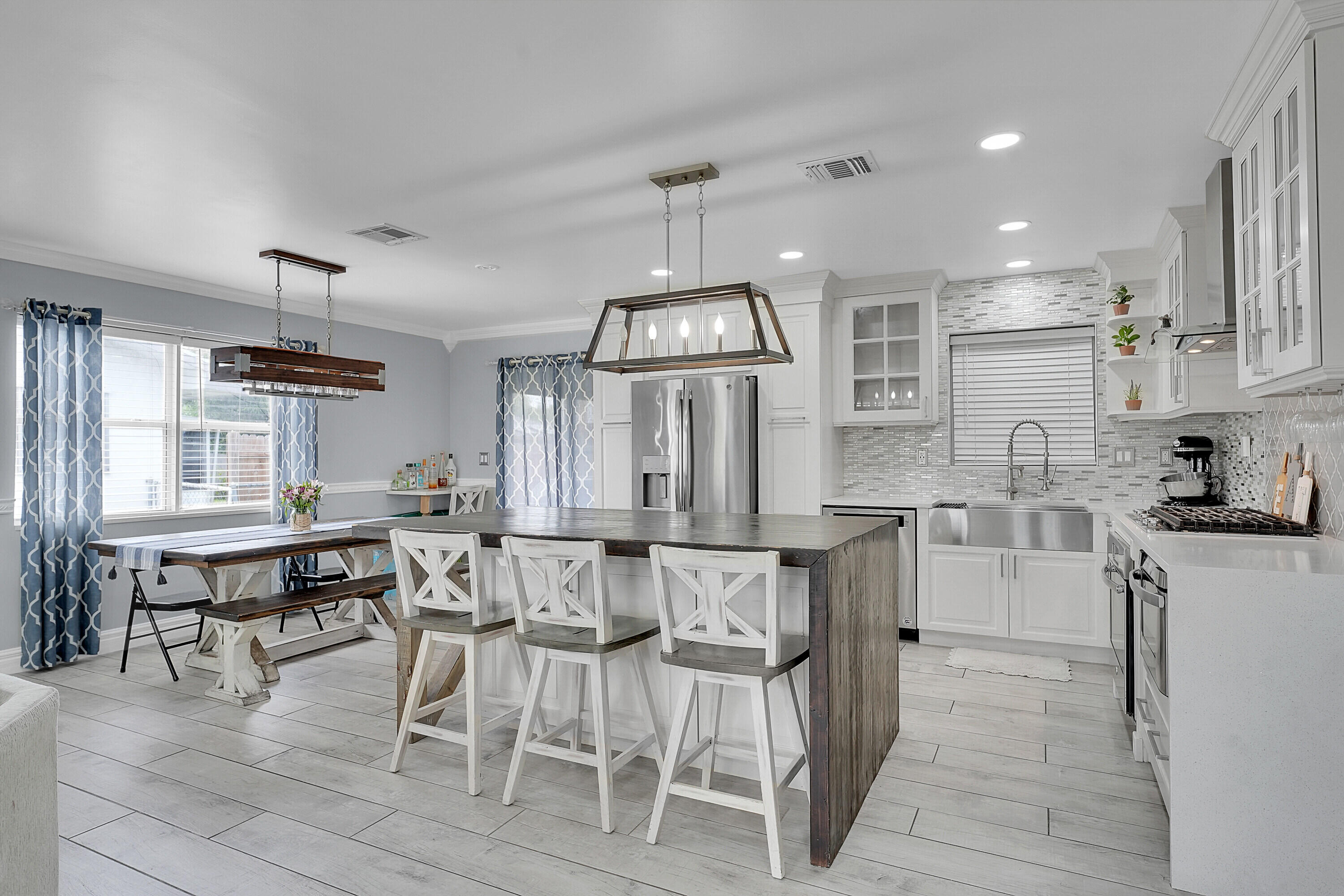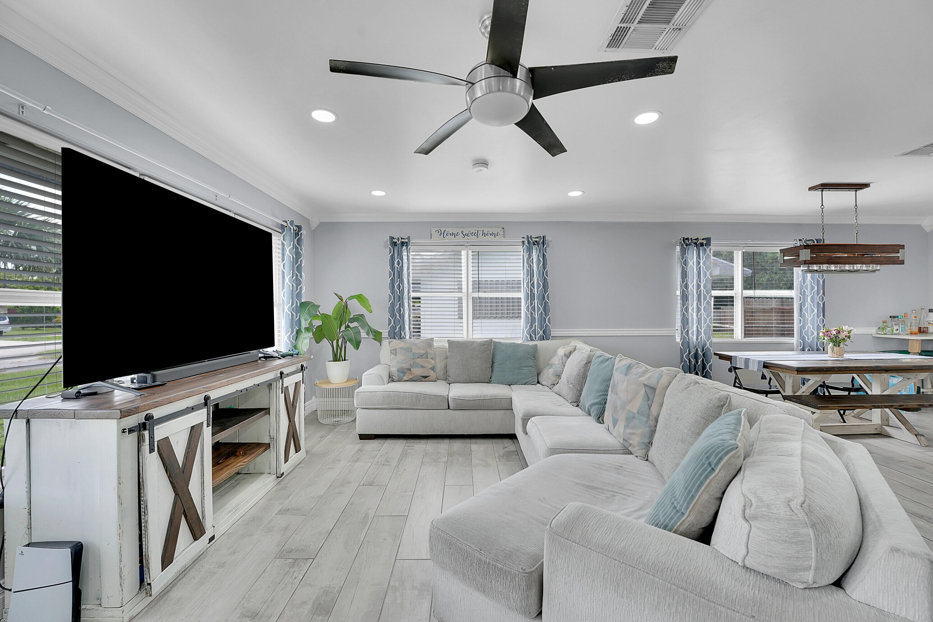 Welcome to this beautifully remodeled and upgraded 3 bedroom, 2 bathroom single story home located in the desirable Knotty Pine Acres community of West Palm Beach. Set on a spacious .17 acre lot with no HOA, this home offers a bright open floor plan with tile flooring throughout and a modern kitchen featuring a central island, pantry space, and upgraded stainless steel appliances. The layout flows easily into the living and dining areas, creating an inviting space for everyday living or entertaining. Both bathrooms have been tastefully renovated, and the home is equipped with storm shutters, central air conditioning, and ceiling fans. Outside, enjoy a spacious covered patio and a large fenced backyard with private garden views - perfect for relaxing or entertaining. Great location!