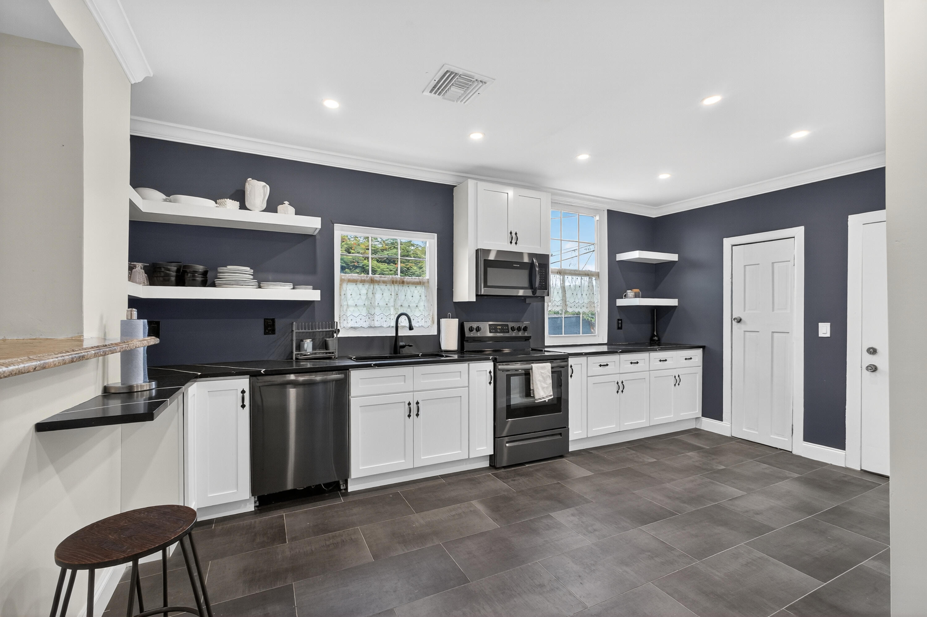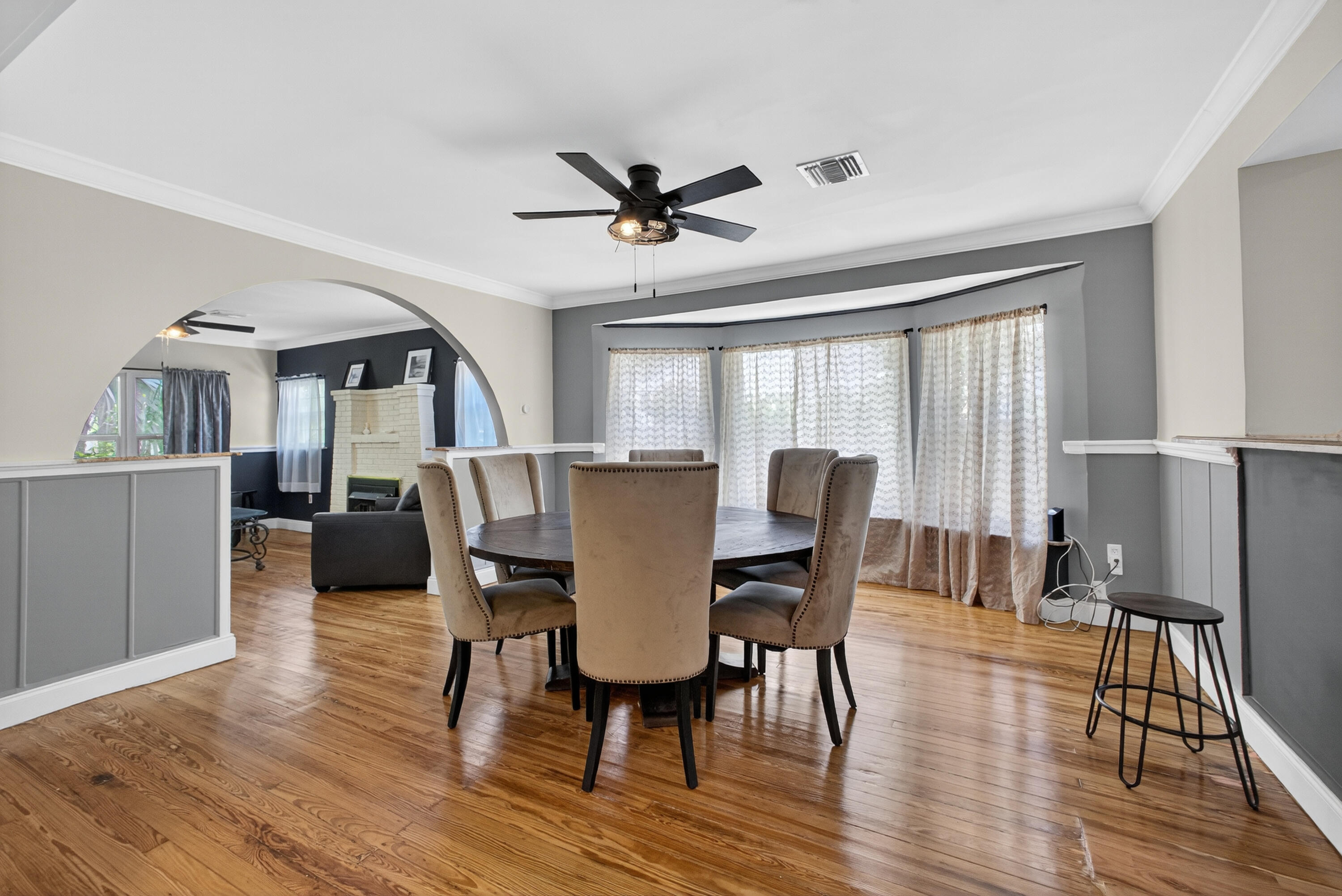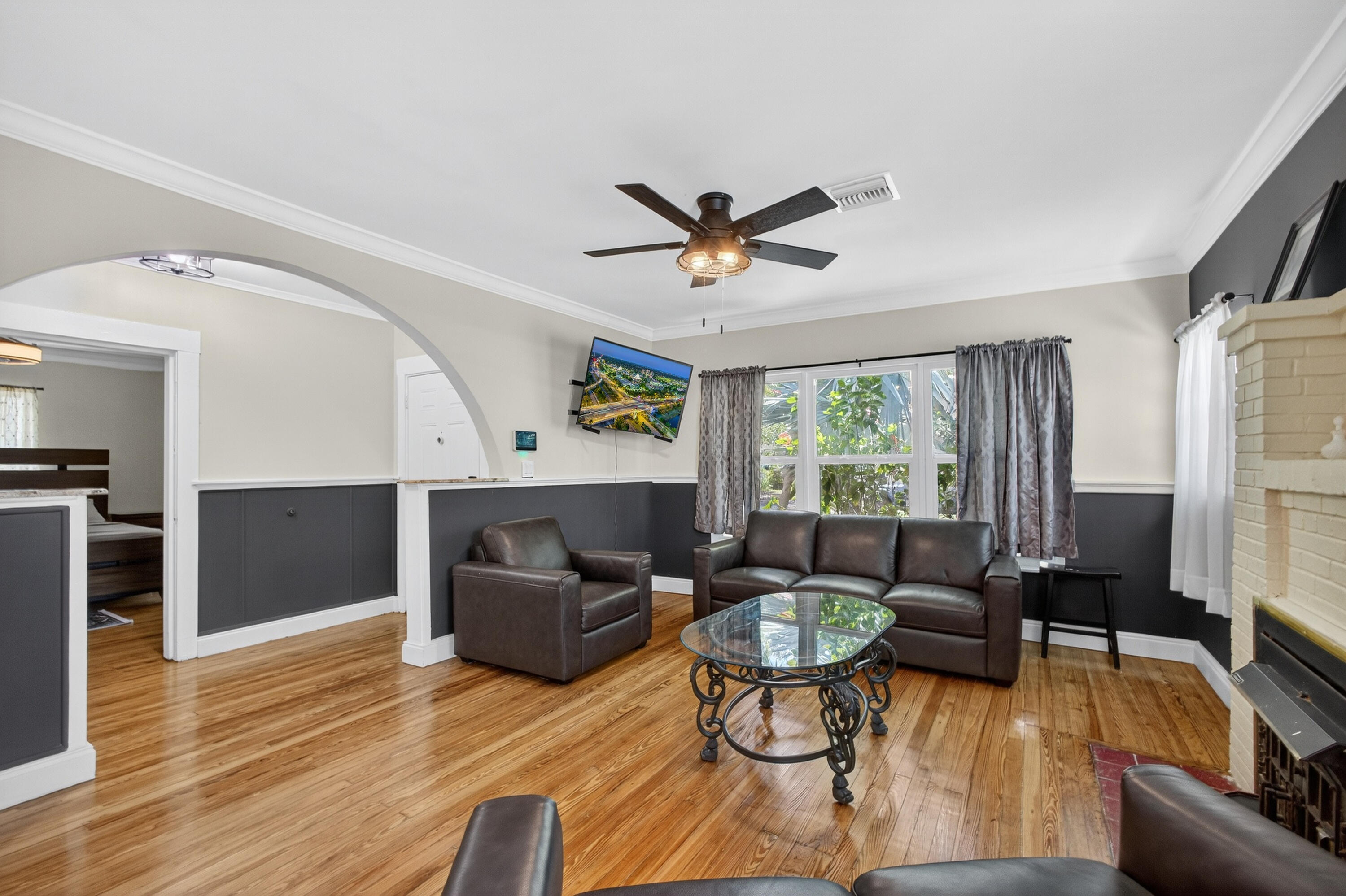 This charming home is a 3bed/3bath with numerous updates including impact windows, restored wood floors, all new kitchen, lighting, new bathrooms plus much more. Tropical landscape leads you into a cozy front porch, then a welcoming foyer, on to the spacious living room that boasts a beautiful fireplace and archway into the dining area with bay windows, then on to the gourmet kitchen and a huge utility room. The main bedroom is on the 1st floor with an en-suite bathroom, bedroom 2 is also an en-suite and has a private entrance, perfect for an in-law suite or income studio, bedroom 3 is upstairs with a huge walk-in closet. The yard is an outdoor oasis with multiple lounging areas, paver patios, artificial turf and fully fenced with lots of parking. Close to beaches and PBI airport. Hurry!