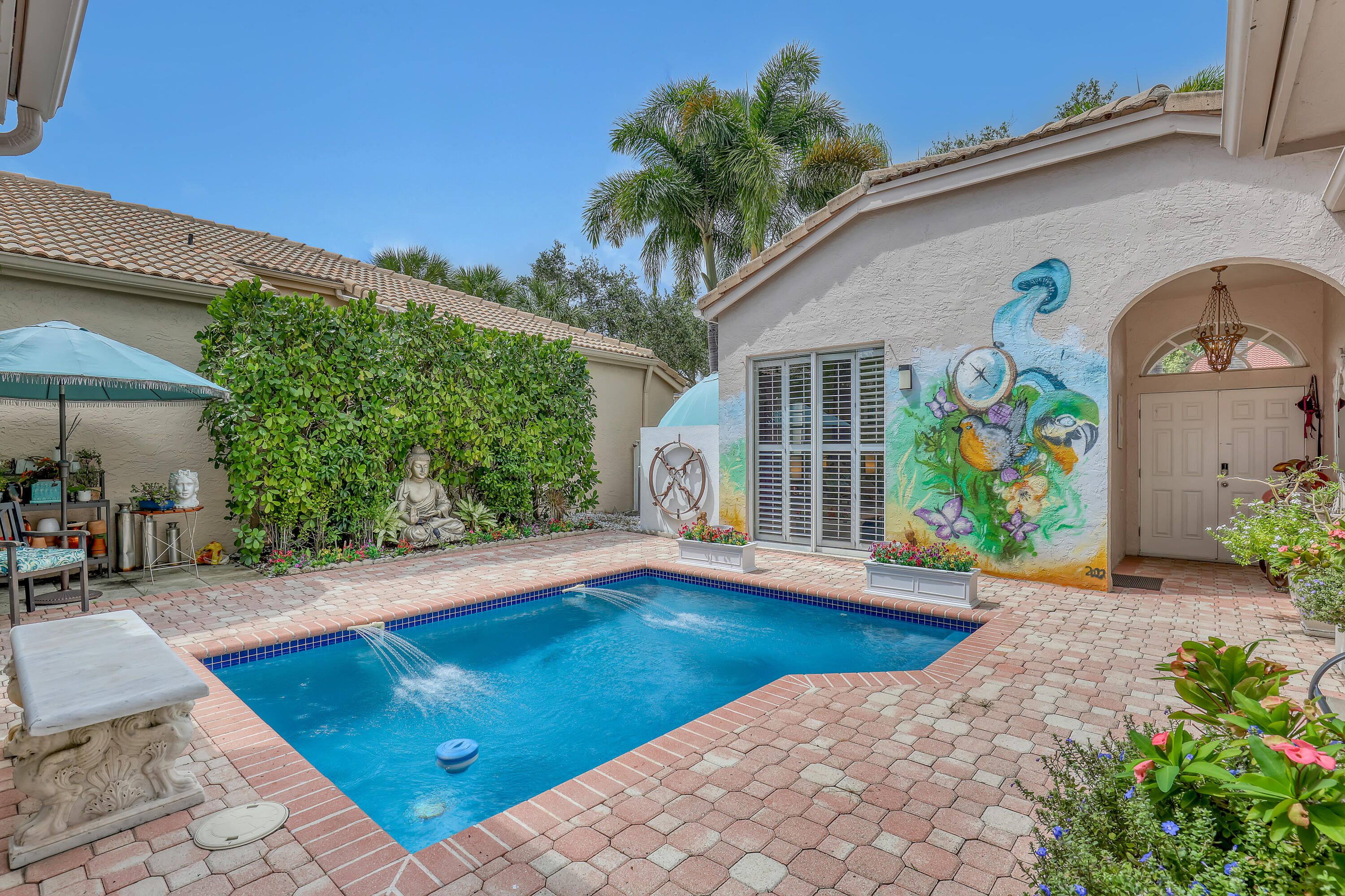 Step into a world of style, comfort and privacy in this beautifully designed 2-bedroom 2- bathroom residence plus 1- bedroom 1- bathroom guest cottage. The home embraces a sun-drenched courtyard pool, bringing the outdoors in, so everyday feels like a resort getaway. The Primary suite is a true retreat, with pool views a generous walk-in closet, a spa inspired bath complete with Roman tub, dual vanities and a separate shower. The second bedroom currently functions as a den with a desk and built in-shelves. Entertain with ease in the formal dining room overlooking a tranquil Zen garden. The guest cottage adds another layer of versatility, complete with a kitchenette, private bedroom, bath and direct pool access ideal for visitors, extended family, or creative studio.