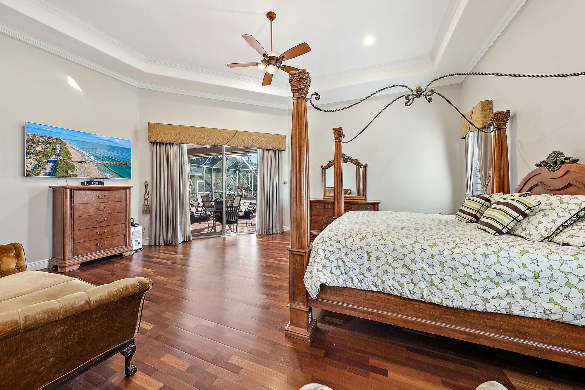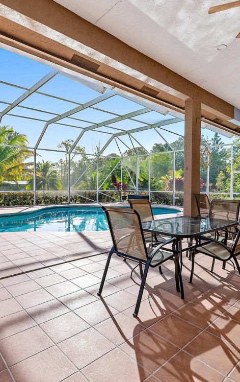Nestled on 2.5 private acres, this beautifully updated estate blends modern comfort with peaceful outdoor living. The roof was replaced (2023), 4-car garage, & three driveways offer style & convenience. Inside, you'll find 4 spacious bedrooms, a flex room/office, & a luxurious primary suite with coffered ceilings, wood floors, dual sinks, a massive dual-entry shower, & a freestanding tub. The chef's kitchen, remodeled in 2021, features Quartzite counters, a large island, wine bar, steam oven, built-in coffee maker, & stainless-steel appliances. Step outside to your entertainer's paradise -- a screened-in pool (new pump installed - 2022), covered lounge, & a fully equipped outdoor kitchen with multiple grills, cooktops, sink, refrigerator, freezer & microwave.