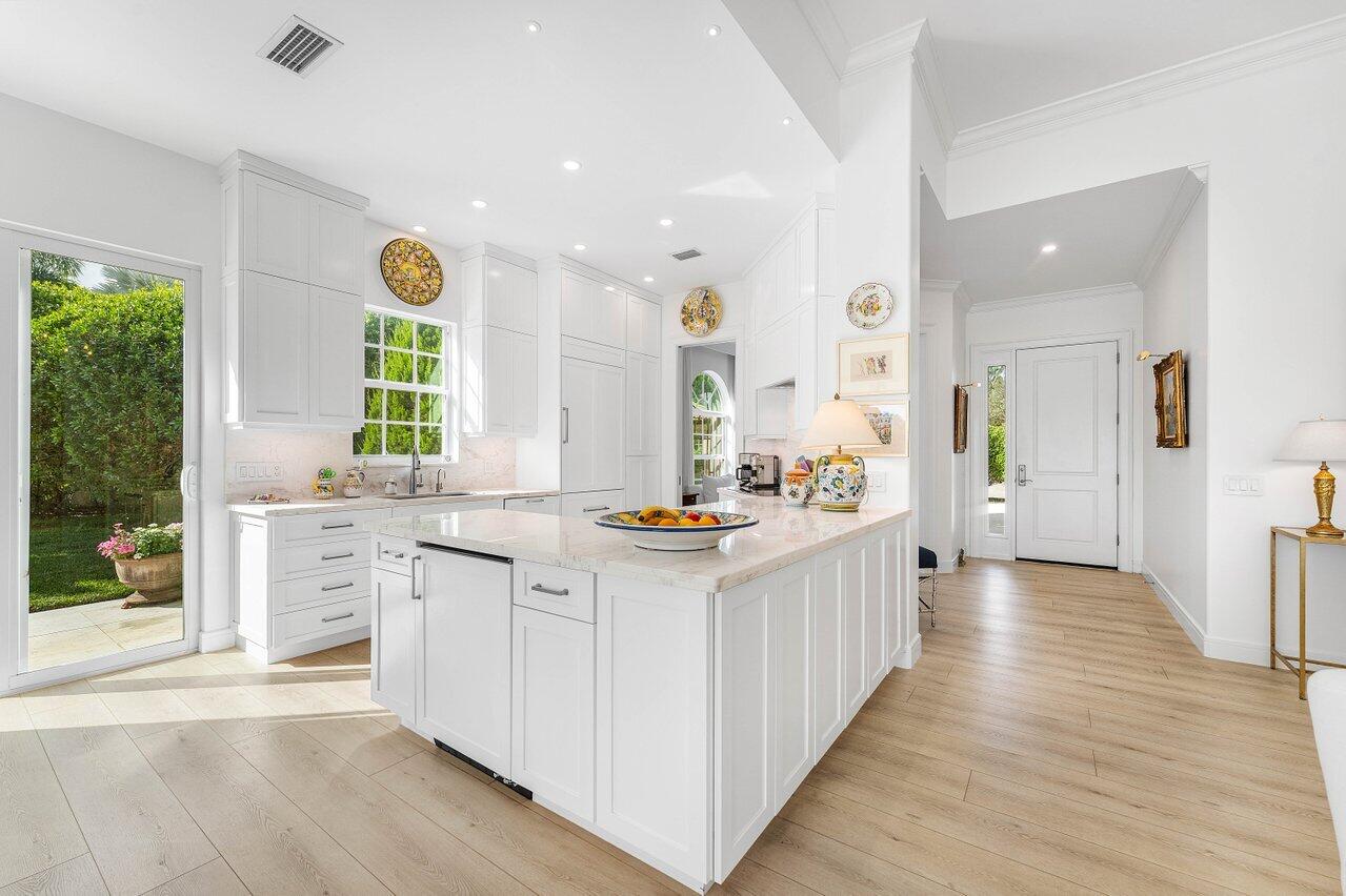Stunning fully renovated 3BD/2BA/plus large den home in the gated RiverWalk community. Set on an oversized, ultra-private lot with river and open field views, this residence features this residence features 12-foot ceilings in the living room and 10-foot ceilings throughout the rest of the home with impact windows and doors, COREtec luxury oak flooring, smooth plaster ceilings, LED recessed lighting, and custom 8' raised doorways and solid wood doors. The chef's kitchen boasts Dolomite Italian marble, custom wood cabinetry, Sub-Zero fridge, and Thermador appliances. The spa-inspired primary bath includes Thassos marble, double vanity, soaking tub, and glass-enclosed shower. Upgrades extend to the tile floored garage, laundry room, and mechanicals, with new AC, water heater, and full home