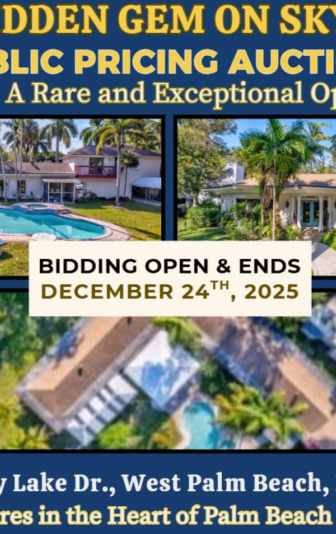Public Pricing Auction Bidding Now Open - All Due by 12/24/2025 List price is minimum price considered. The Hidden Gem on Skylake -- A Rare & Exceptional Opportunity, Estate Home on 3.31 Acres in the Heart of Palm Beach County, 4,661 Square Feet with 3,704 Square Feet under A/C.Tucked quietly at the end of Skylake Drive, this South Florida retreat is one of those properties you almost can't believe still exists. Surrounded by majestic palms, privacy, and open land, it's the kind of place families dream of turning into a compound -- or developers recognize instantly as the infill opportunity they've been waiting for. Minutes to Palm Beach International Airport, a straight shot to the beach, and everything you need. Built in 1996, New Roof in 2016. Bid now, makes a great holiday gift.