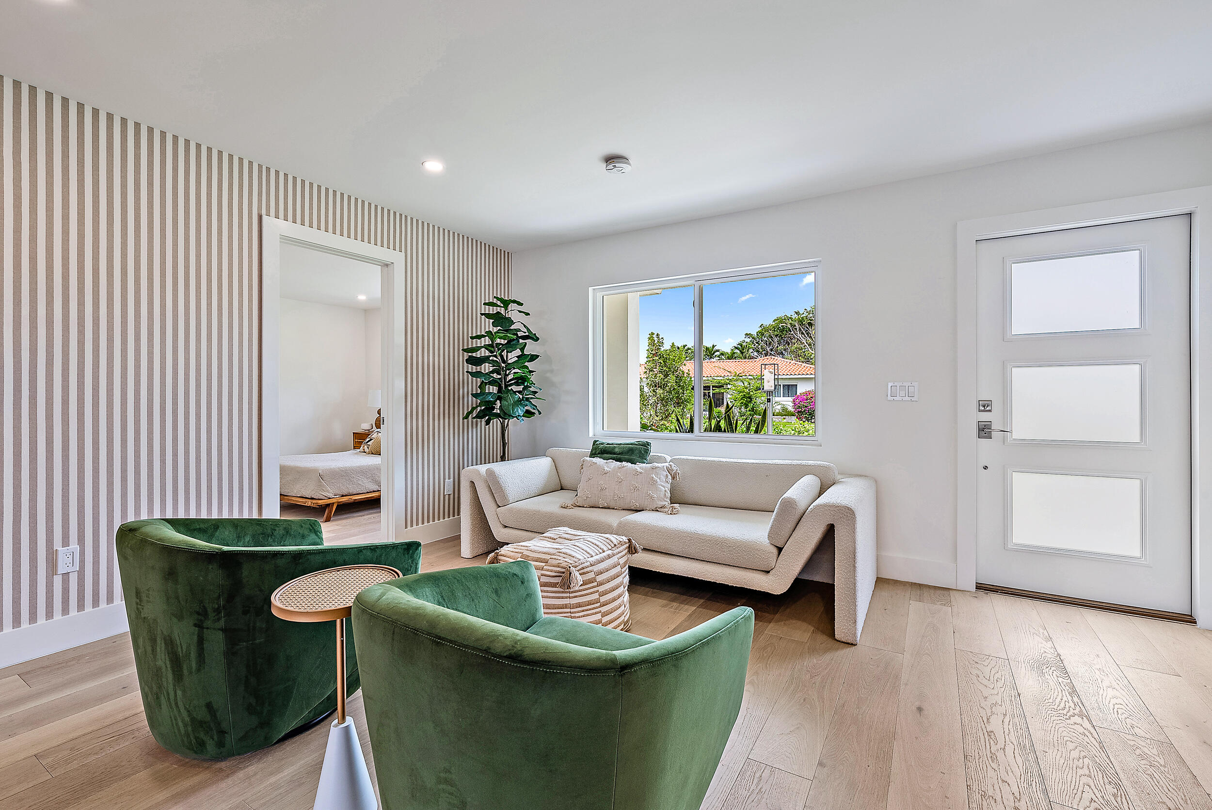 This beautifully reimagined and fully rebuilt home offers four bedrooms, three and a half baths, plus a versatile office that can serve as a fifth bedroom. Designed with abundant natural light, the residence centers around a chef's kitchen with a gas stove, refrigerator columns, an expansive island with honed quartzite countertops, and direct views of the new swimming pool and spa. The split master suite features a spacious walk-in closet, dual vanities, a large shower, and a soaking tub. Every detail showcases high-end finishes, and the property's prime SoSo location places you close to top restaurants, shopping, Palm Beach, the Kravis Center, and PBI Airport.