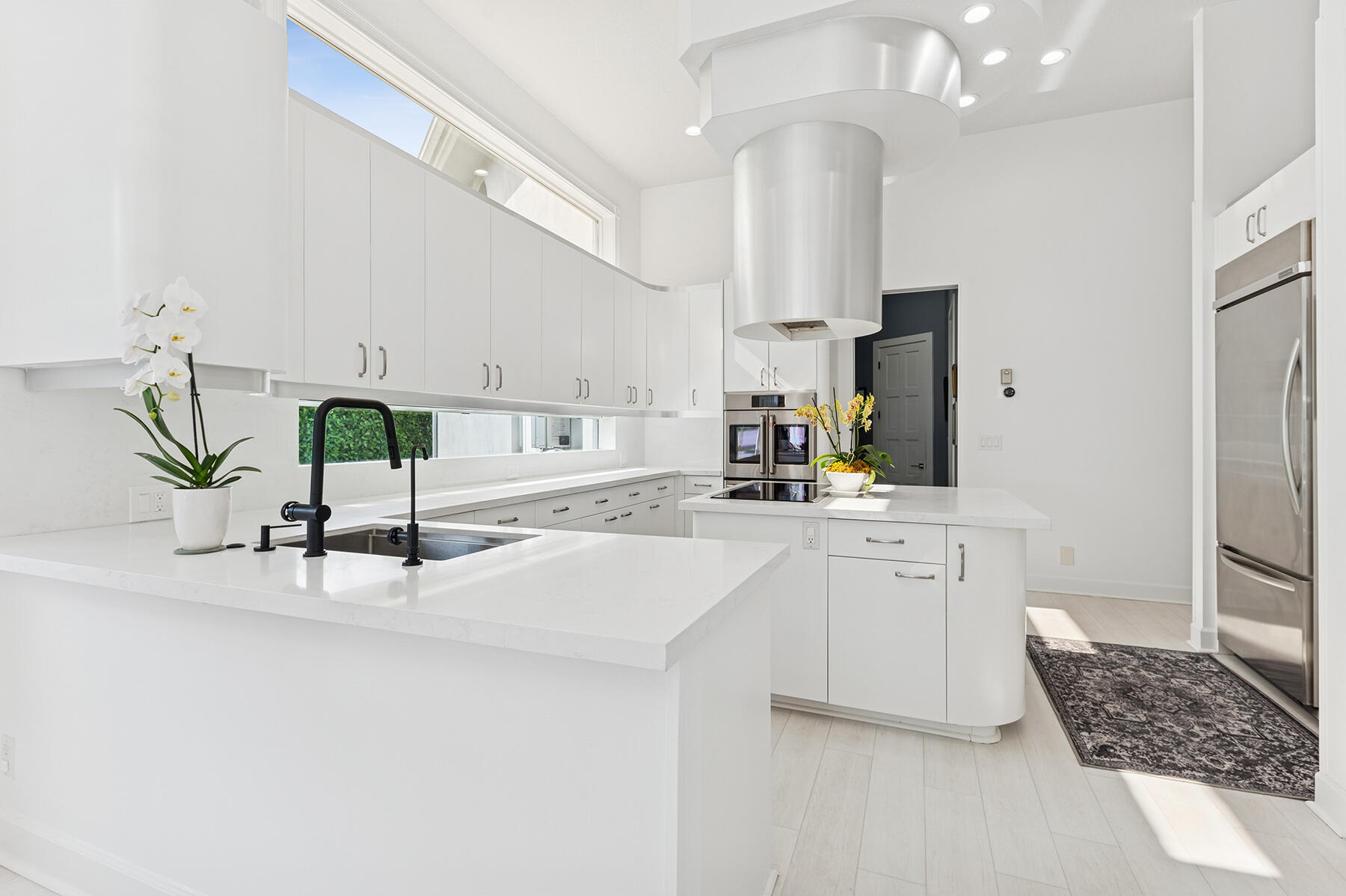 Bring your cherished antique and collectible cars to this spectacular contemporary residence, perfectly tucked away on a peaceful cul-de-sac overlooking the sparkling waters of Lake Mangonia. Custom built in 2019 by the current owner, this gracious home offers a versatile canvas designed to complement a wide range of taste and lifestyles. Nestled in the heart of West Palm Beach within the prestigious gated community of Presidential Estates, the property features a luxurious first-floor primary suite with a spa-inspired en-suite bath, a private workout/massage room, and a flexible loft space ready to adapt to your needs. Soaring ceiling and expansive windows bathe the interiors of this home in natural light, creating an open, airy atmosphere. Multiple sliding glass doors seamlessly