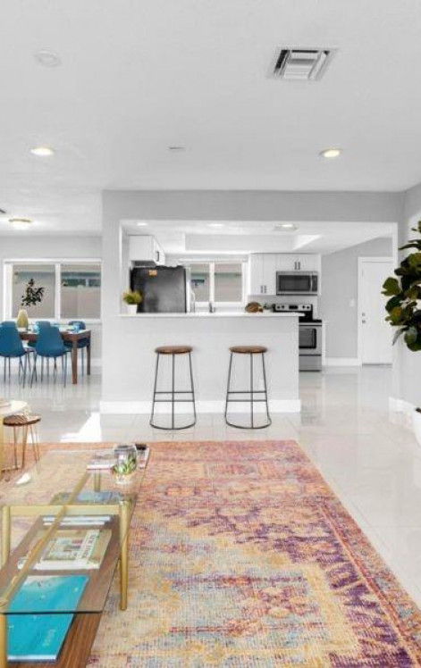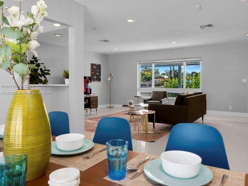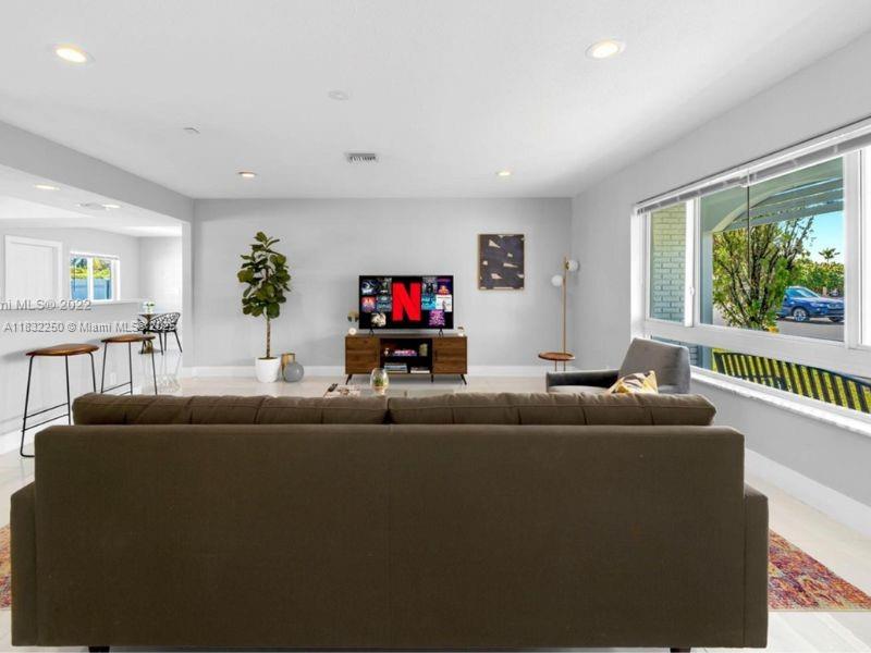 Fully renovated 4 bed, 3 bath home in corner lot in Wilton Manors. Spacious and bright! 36' x 36' tile throughout. Great for entertaining, with formal and informal dining spaces. Glass enclosed showers in bathrooms. Recessed LED lighting in living room and kitchen bar. All impact windows throughout. The fourth bedroom can be used as an office or den with private street entrance off the kitchen, and 3rd bathroom in the 2-car garage. Beautiful outdoor living space with yard, built-in grill in outside patio, with plenty of additional space for entertaining.